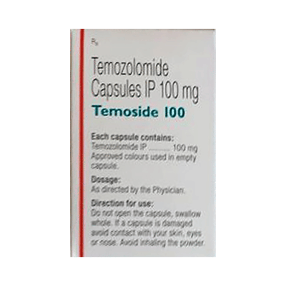Temoside 100 Capsule is used in the treatment of a specific type of cancer of the brain. It is used to treat brain tumors if they return or get worse after standard treatment. It may be also used to treat other conditions, as determined by the doctor. Temoside 100 Capsule should be taken empty stomach and at same time each day to make sure it has the best effect. Your doctor will decide what dose is necessary and how often you need to take it. This will depend on what you are being treated for and may change from time to time. You should take it exactly as your doctor has advised. Taking it in the wrong way or taking too much can cause very serious side effects. It may take several weeks or months for you to see or feel the benefits but do not stop taking it unless your doctor tells you to.The most common side effects of this medicine include nausea, vomiting, constipation, headache and fatigue. This medicine may reduce the number of blood cells in your blood thereby, increasing the susceptibility to infections. Regular blood tests are required to check your blood cells along with kidney, liver and heart function during treatment with this medicine.Before taking it, tell your doctor if have bleeding, liver, or kidney problems or are taking any medicines to treat infections. Many other medicines can affect, or be affected by, this medicine so let your doctor know all medications you are using. This medicine is not recommended during pregnancy or while breastfeeding. It may harm your baby. You and your partner should avoid becoming pregnant or fathering a child for several months after your treatment with it has stopped.