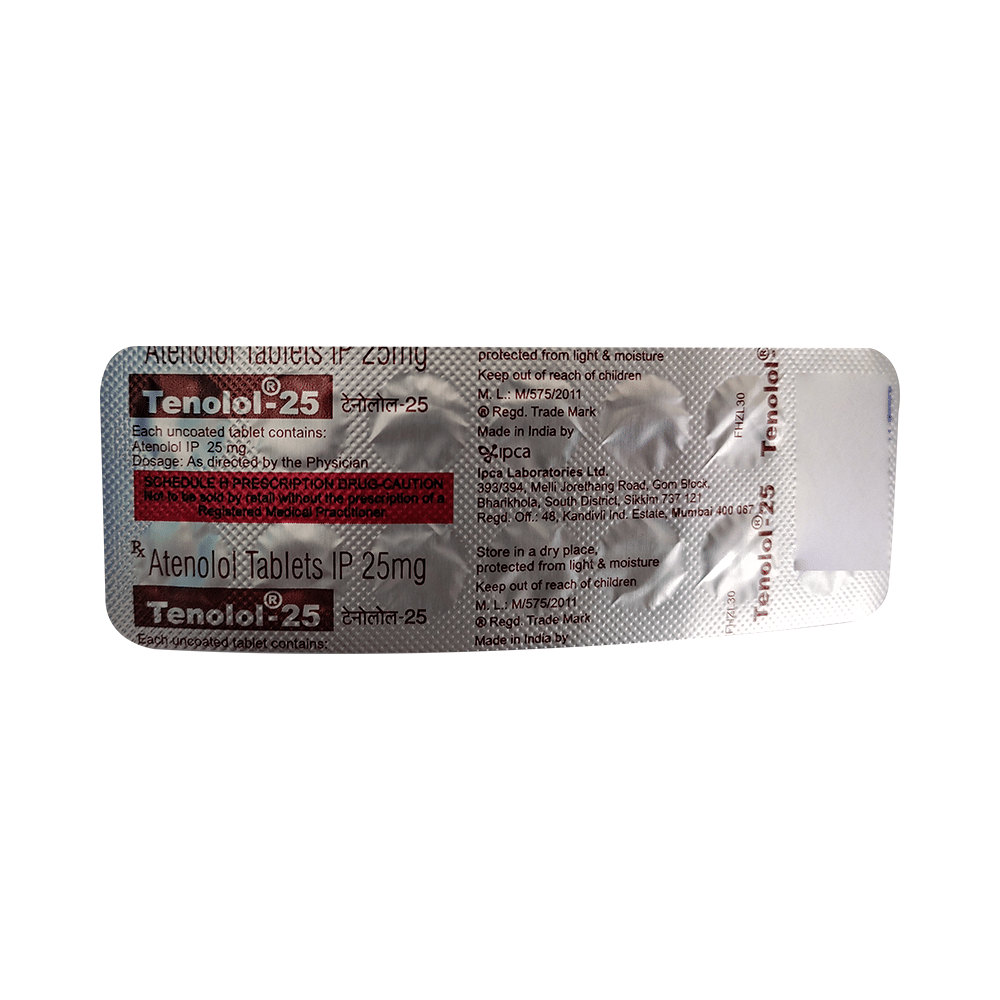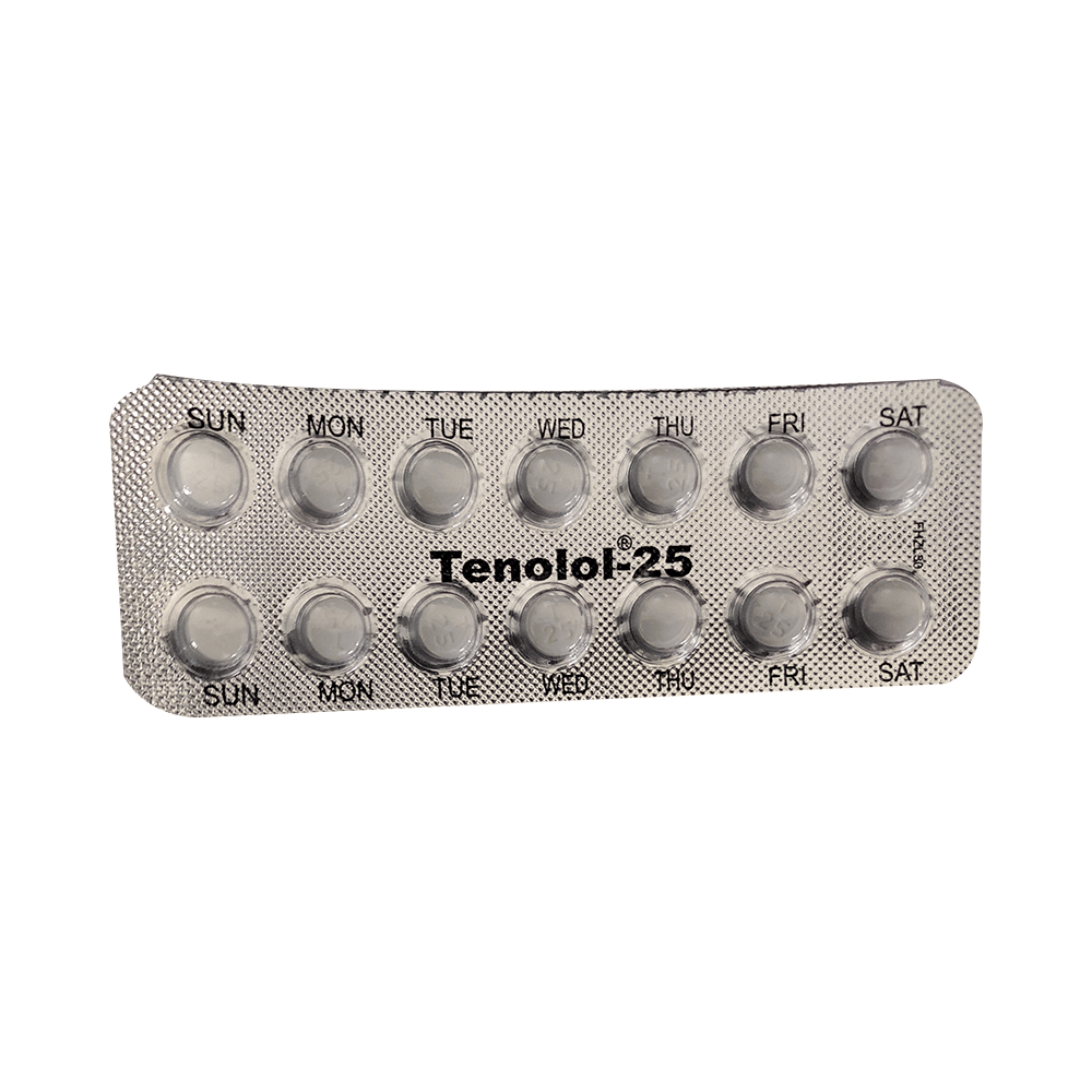 Tenolol 25 Tablet belongs to a group of medicines called beta-blockers. It is used to treat high blood pressure (hypertension), angina (heart-related chest pain), irregular heart rhythms (arrhythmia). It also helps to prevent future heart attacks and stroke. Tenolol 25 Tablet may be prescribed alone or together with other medications. The dose and frequency depend on what you are taking it for and the severity of your condition. It may be taken empty stomach or with a meal, but take it regularly at the same time each day to get the most benefit. It may take several weeks before you get the full benefit of this medicine and you may need to take it for the rest of your life. However, it is important to continue taking it even if you feel well. Most people with high blood pressure do not feel ill and if you stop taking it, your condition may worsen.The main side effects of this medicine are fatigue, slow heart rate, feeling dizzy, diarrhea, and nausea. These are usually mild and short-lived. It may also cause shortness of breath or low blood pressure in some people. To reduce the risk of side effects your doctor will probably start the medicine at a low dose and gradually increase it. Consult your doctor if the side effects bother you or do not go away.Before taking it, let your doctor know if you have any liver problems. It may also not be suitable for people who have a slow heart rate, severe circulation problems, severe heart failure, or low blood pressure. Pregnant or breastfeeding mothers should also consult their doctor before taking it. You must talk to your doctor to find out whether this medicine is suitable for you to use. You should have your blood pressure checked regularly to make sure that this medicine is working properly. Avoid drinking alcohol as it may increase certain side effects.