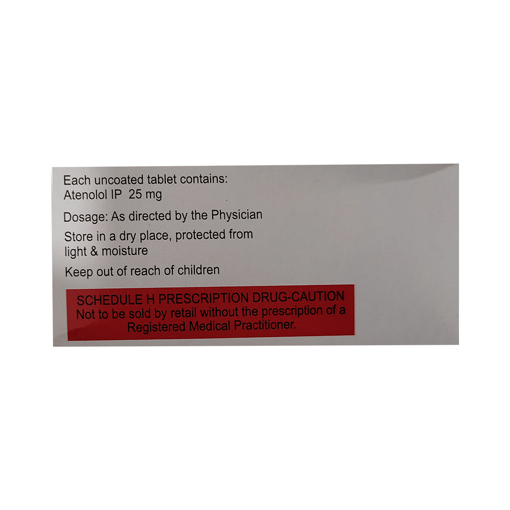 In Treatment of Angina (heart-related chest pain)Tenolol 25 Tablet relaxes the blood vessels so that blood can flow more easily around your body and makes sure that your heart is getting a good supply of oxygen. This makes it less likely that you will suffer chest pain caused by angina. This medicine can help increase your ability to exercise and go about your daily life more easily by reducing the frequency of angina attacks. You should take it regularly and as long as it is prescribed for it to work effectively.In Treatment of ArrhythmiaTenolol 25 Tablet is used to stabilize heart rhythms (particularly atrial fibrillation). It helps in normalizing an abnormal heart rhythm, preventing it occurring in the first place or slowing down the heart rate during an episode.In Prevention of Heart attackTenolol 25 Tablet helps lower your blood pressure and make it easier for your heart to pump blood around your body. This reduces the chances of you having a heart attack. It can also reduce the risk of dying if it is given immediately after a heart attack. This medicine needs to be taken regularly to be effective, so keep taking it even if you feel well. Do not stop without talking to your doctorIn Treatment of Hypertension (high blood pressure)Tenolol 25 Tablet works by blocking the effects of some chemicals on your heart and blood vessels. It slows down your heart rate and helps the heartbeat with less force. This lowers your blood pressure and helps in reducing your risk of having a stroke, a heart attack, other heart problems, or kidney problems in the future. This medicine needs to be taken regularly to be effective, so keep taking it even if you feel well. Do not stop without talking to your doctor.show moreshow less