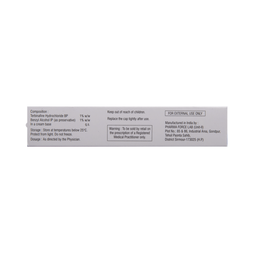 Terbinaforce Cream is used to treat a wide range of fungal infections of the skin and nails, including ringworm. It works by killing the fungi that cause the infection. This helps in clearing the infection and speeds up the healing process. Terbinaforce Cream is for external use only. It should be used in the dose and duration suggested by the doctor. The affected area should be clean and dry before the application of this medicine. You must wash your hands thoroughly before and after application. Do not stop using it until you have finished the complete course, even when you feel better. If you stop using this medicine too early, the fungi may continue to grow, and the infection may return or worsen.The most common side effects of this medicine include application site reactions like irritation, itching, redness (pruritus), and skin peeling (exfoliation). These are usually mild, but let your doctor know if they bother you or last more than a few days.Avoid direct contact with the eyes, nose, or mouth. If accidental exposure occurs, rinse immediately with plenty of water. You must inform your doctor if there is no improvement even after four weeks of treatment. It is not likely that other medicines you take by mouth or injection will affect the way this medicine works, but inform your doctor about all other medicines you are taking. Also, let your doctor know if you have used a similar medicine before and had an allergic reaction. Pregnant and breastfeeding mothers should consult their doctor before using it.