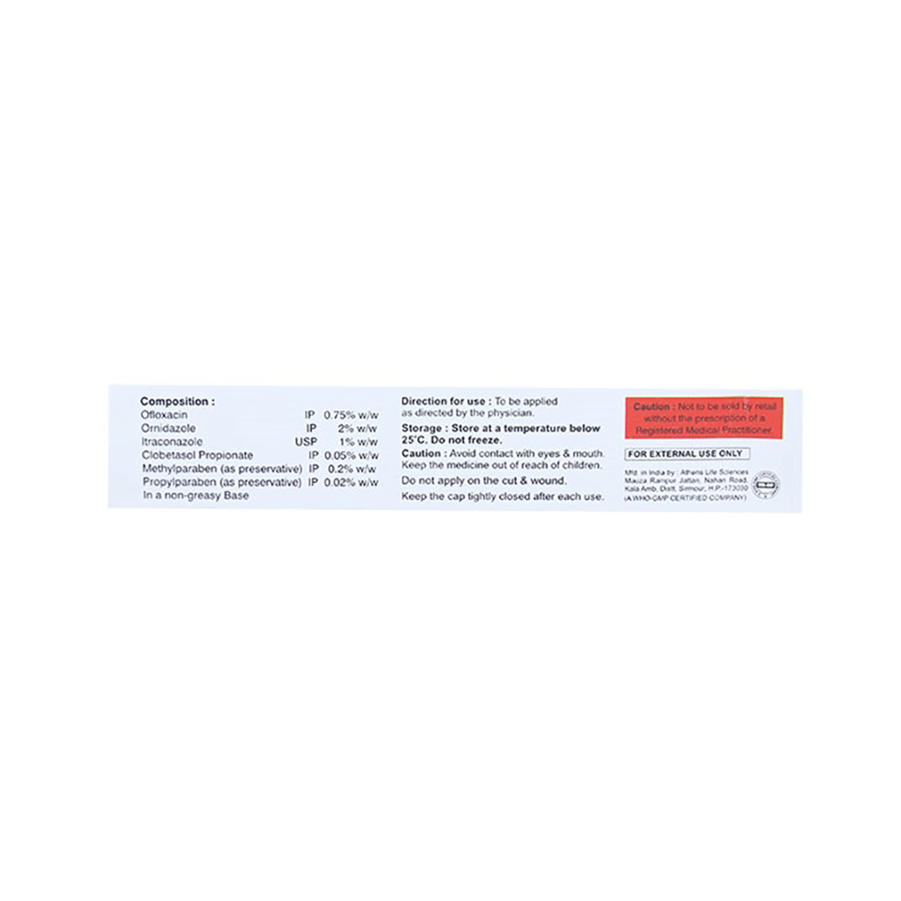 Salt Composition: Ofloxacin (0.75% w/w) + Ornidazole (2% w/w) + Itraconazole (1% w/w) + Clobetasol (0.05% w/w)