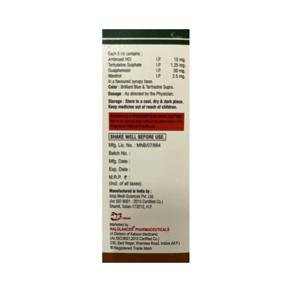 Salt Composition: Ambroxol (15mg/5ml) + Guaifenesin (50mg/5ml) + Menthol (2.5mg/5ml) + Terbutaline (1.25mg/5ml)
