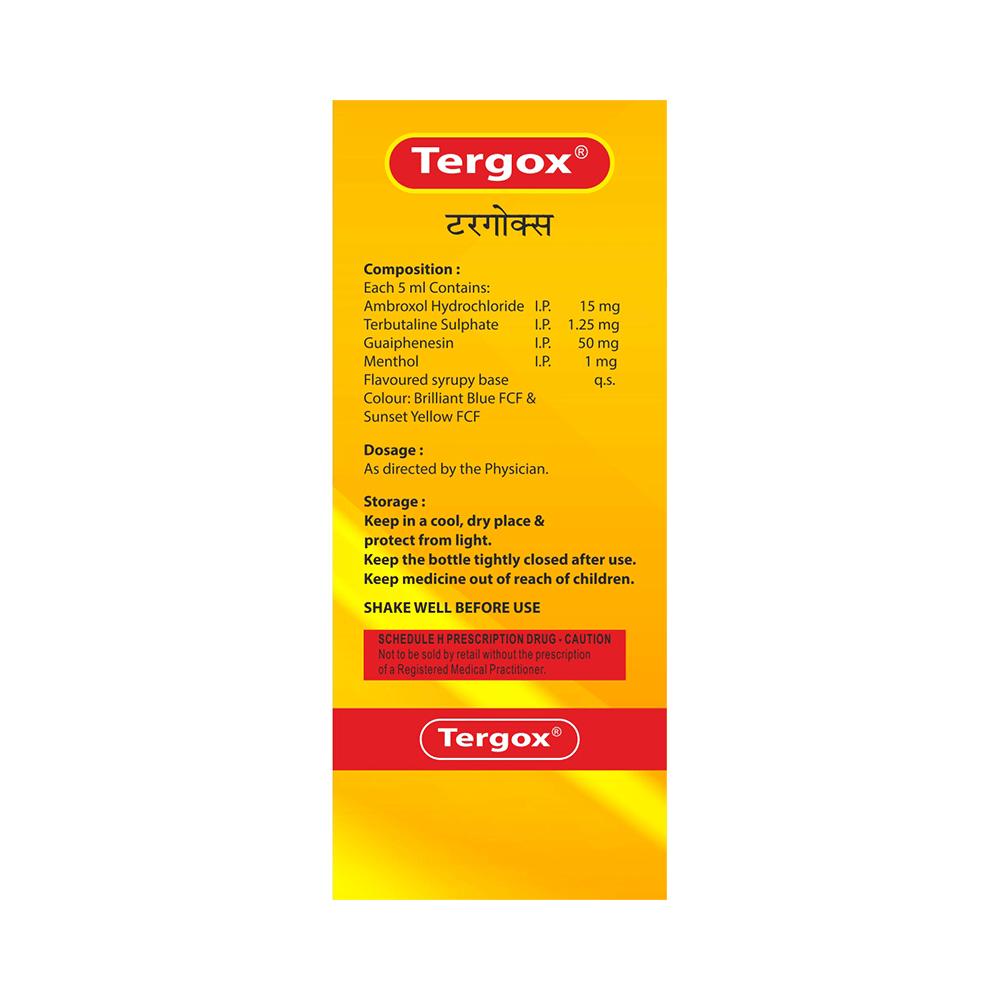 Tergox Syrup is a combination medicine used to treat cough. It thins the mucus in the nose and windpipe, making it easier to cough out. This medicine also relieves throat irritation and provides cooling sensation. Tergox Syrup is taken with or without food in a dose and duration as advised by the doctor. The dose you are given will depend on your condition and how you respond to the medicine. You should keep taking this medicine for as long as your doctor recommends. If you stop treatment too early your symptoms may come back and your condition may worsen. Let your doctor know about all other medications you are taking as some may affect, or be affected by this medicine.The most common side effects are nausea, diarrhea, vomiting, stomach discomfort, headache, rash, tremor, and increased heart rate. Most of these are temporary and usually resolve with time. Contact your doctor straight away if you are at all concerned about any of these side effects. This medicine can also cause sleepiness, so do not drive or do anything that requires mental focus until you know how this medicine affects you. Avoid drinking alcohol while taking this medicine as it can make sleepiness worse.Never support self-medication or recommend your medicine to another person. It is beneficial to have plenty of fluids while taking this medication. Before taking this medicine, you should tell your doctor if you are pregnant, planning pregnancy or breastfeeding.