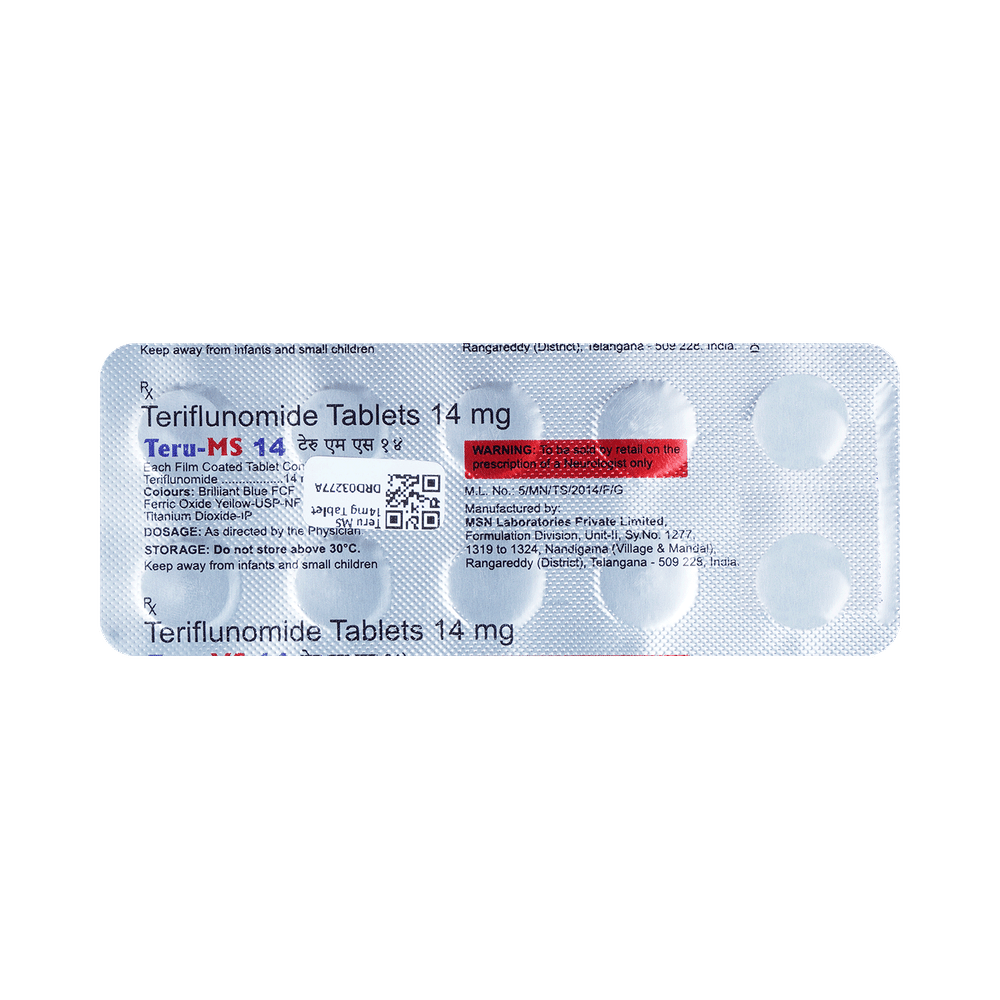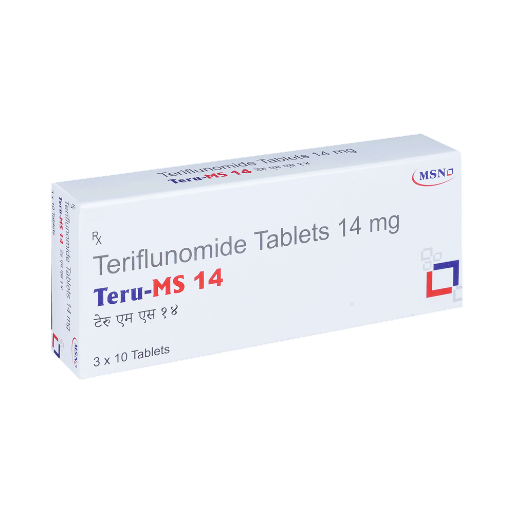 Teru MS 14mg Tablet is a medicine used in the treatment of relapsing forms of multiple sclerosis (MS). It works by limiting the function of specific immune cells that cause nerve damage in multiple sclerosis. This way it prevents relapse as well as reduces the progression of the disease. Teru MS 14mg Tablet may be taken with or without food. Take it regularly and at the same time each day to get maximum benefits from it. Do not stop taking it until you have completed the course. Regular blood and urine tests to monitor your blood cells and kidney and liver function may be required during treatment with this medicine.Common side effects of this medicine include increased liver enzymes, hair loss, diarrhea, influenza, and nausea. If any of these side effects bother you, let your doctor know. They may be able to help find ways to treat or manage the side effects.This medicine should not be taken by pregnant women. Inform your doctor if you are pregnant, planning to become pregnant, or breastfeeding. Let your doctor also know if you have any other medical conditions. Additionally, tell your doctor about all the other medicines you are taking to make sure it is safe for you.