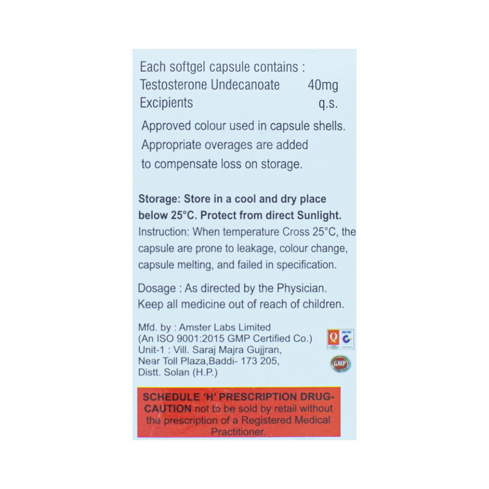 Testosure Softgel Capsule is similar to the natural male hormone, testosterone. It works by replenishing the deficient testosterone levels in adult men. Lack of testosterone may cause various health problems including impotence, infertility, low sex drive, tiredness, depressive mood and bone loss.