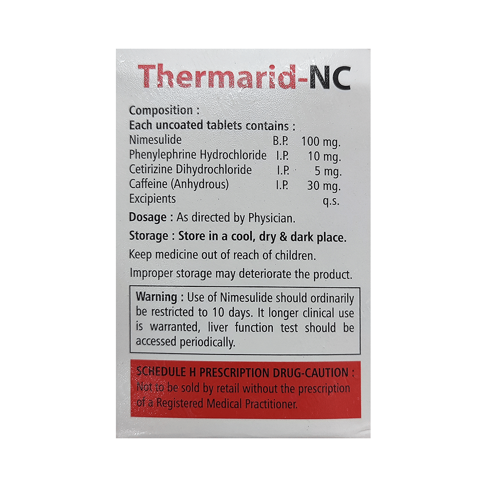Thermarid-NC Tablet is a combination of four medicines: nimesulide, phenylephrine, cetirizine, and caffeine, which relieves aches and fever associated with a cold. Nimesulide is a non-steroidal anti-inflammatory drug (NSAID). It works by blocking the release of certain chemical messengers that cause pain and inflammation (redness and swelling). Phenylephrine is a decongestant that narrows the small blood vessels, providing relief from congestion or stuffiness in the nose. Cetirizine is an antiallergic that relieves allergy symptoms, such as a runny nose, watery eyes, and sneezing. Caffeine is a stimulant that decreases sleepiness caused by cetirizine.