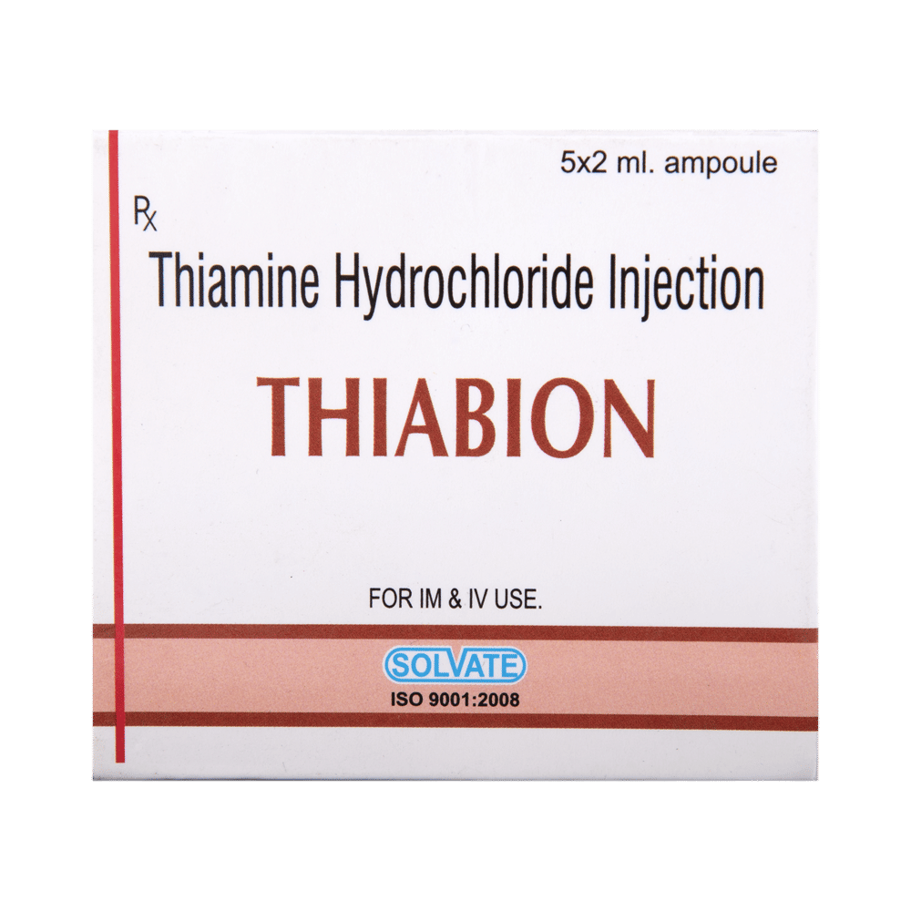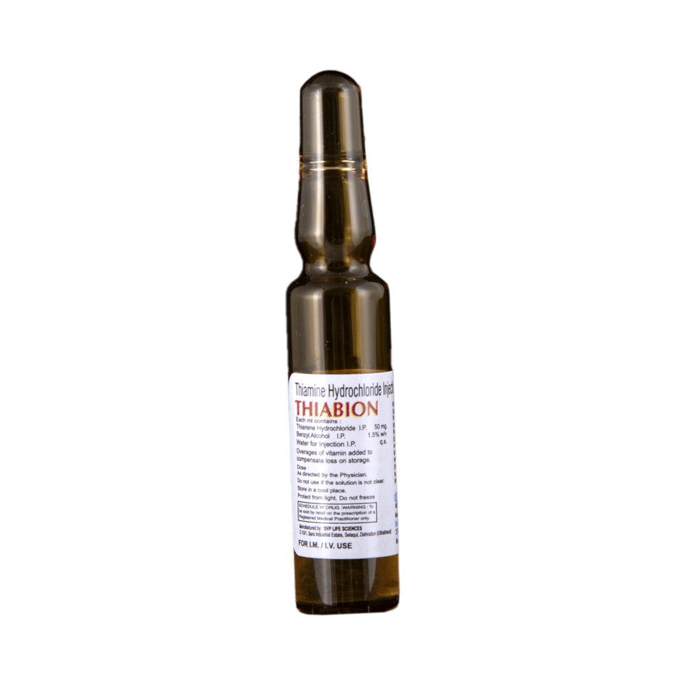 Thiabion Injection is a supplement of vitamin B1. It is used in the treatment of vitamin B1 deficiency. It is an important nutrient which helps the body to perform various functions. It can also be helpful in digestive problems including poor appetite, ulcerative colitis, and ongoing diarrhea. Thiabion Injection is given under the supervision of a healthcare professional and should not be self-administered. You should take it regularly to get the most benefit from it. This medicine may be only part of a complete program of treatment that also includes making changes to your diet and taking calcium and vitamin supplements.Thiabion Injection may cause some common side effects such as injection site reactions, skin irritations, cough, and decreased blood pressure. Before taking this medicine, let your doctor know if you have any heart, kidney, or liver disease. Some other medicines can decrease the absorption of vitamins so let your doctor know all other medicines you are taking to make sure you are safe. It is important to ask your doctor's advice before taking any other vitamin supplements.