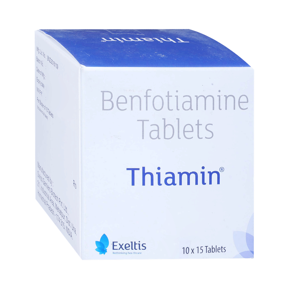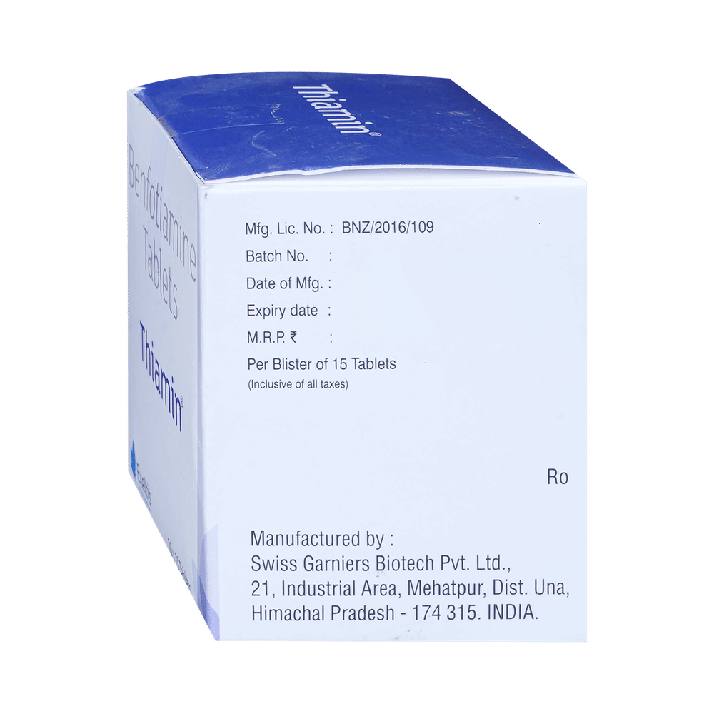 THIAmin Tablet is a dietary supplement of thiamine (vitamin B1). It is used in the treatment of nutritional deficiencies caused by low levels of thiamine in the body. It protects the body from conditions caused due to low levels of thiamine such as heart and nerve disorders. This medicine is to be taken in the dose and duration as advised by your doctor. It is to be swallowed as a whole and not to be crushed or chewed. This medicine is to be taken with or without food but it should be taken at a fixed time. The common side effects seen with this medicine include skin rash and stomach discomfort.Before taking this medicine, let your doctor know if you have any preexisting medical conditions. Let your doctor also know about all the medicines you are taking. Try to avoid or limit the consumption of alcohol while on treatment with this medicine.