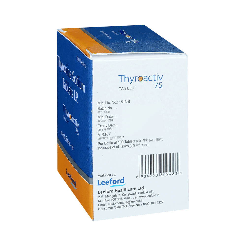 Thyroactiv 75 Tablet is a medicine used to treat an underactive thyroid gland (hypothyroidism). It replaces the hormone which is not being produced by your thyroid gland in sufficient quantity and helps regulate your body’s energy and metabolism. Before you start taking Thyroactiv 75 Tablet, your doctor will do a blood test to see what dose you need. Once you start taking the medicine, you will have regular blood tests to see how well it is working, and the dose may be adjusted from time to time. It is best taken on an empty stomach before your first meal of the day. You should take this medicine regularly to get the maximum benefit. It may take several weeks before your symptoms start to improve. You may need to take it for the rest of your life. If you stop taking it, your symptoms are likely to come back.The most common side effects of this medicine are caused by taking a higher dose than you need. Possible side effects include palpitations (irregular heartbeat), vomiting, anxiety, diarrhea, weight loss, tremors, increased appetite, and restlessness. Most side effects will disappear once you are on the right dose. Call your doctor straight away if you have a very high temperature, fast or irregular heart rate, low blood pressure, yellowness in the eye/skin, confusion, or fits.Thyroactiv 75 Tablet may cause weight loss but should not be prescribed or taken to treat obesity. If you become pregnant while taking this medicine, inform your doctor right away as the dose may have to be increased/readjusted. Many other drugs affect the way this medicine works. Ask your doctor for advice if you are taking any other medications.