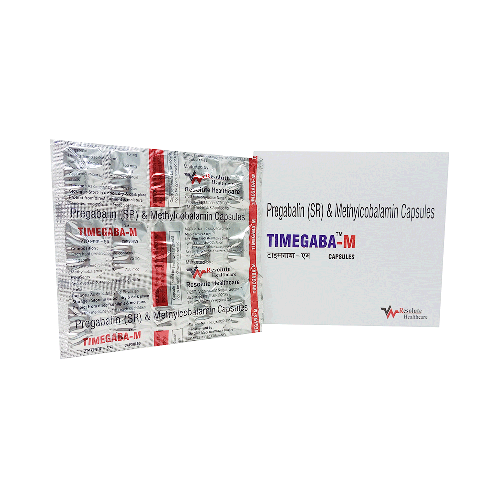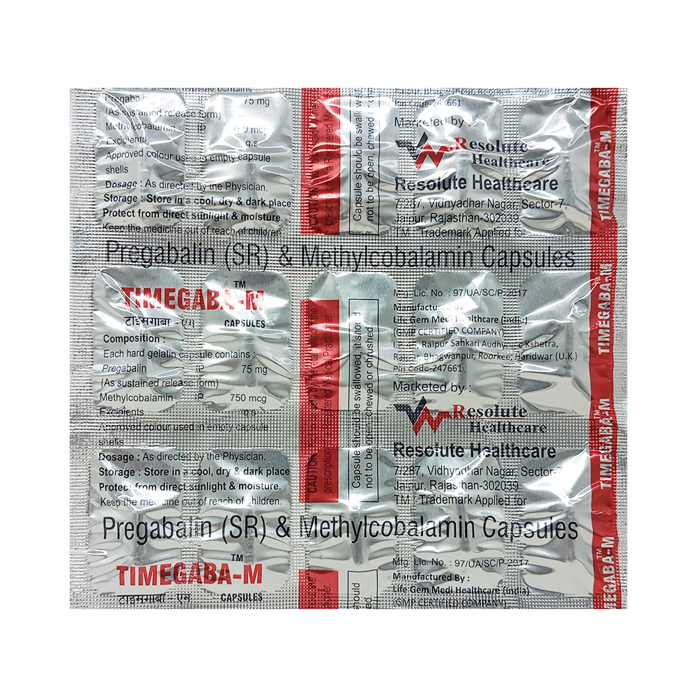 Timegaba-M Capsule SR is a prescription medicine used for the treatment of neuropathic pain. It decreases pain by modulating the calcium channel activity of the nerve cells. This medicine also protects nerve fibers and heals damaged nerve cells. Timegaba-M Capsule SR may be taken with or without food, preferably at bedtime. It is advised to take it at the same time each day as this helps to maintain a consistent level of medicine in the body. Take this medicine in the dose and duration advised by your doctor. If you miss a dose of this medicine, take it as soon as you remember. Finish the full course of treatment even if you feel better. This medication must not be stopped suddenly without talking to the doctor.Some common side effects of this medicine include nausea, vomiting, diarrhea, constipation, blurred vision, dizziness, and sleepiness. Do not drive or do anything that requires mental focus until you know how this medicine affects you. The side effects are mild and usually improve with time. It may also cause weight gain in some people. Exercise regularly and have a balanced diet to keep your weight in check. Inform your doctor if you develop any unusual changes in mood or behavior, new or worsening depression, or suicidal thoughts.Your doctor should also know about all other medicines you are taking, as many of these may make this medicine less effective or change the way it works. Inform your doctor if you are pregnant, planning pregnancy, or breastfeeding to make sure it is safe for you and the developing baby.