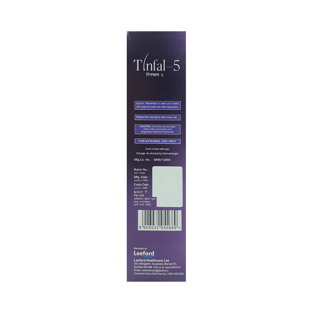 Tinfal 5 Solution may be unsafe to use during pregnancy. Although there are limited studies in humans, animal studies have shown harmful effects on the developing baby. Your doctor will weigh the benefits and any potential risks before prescribing it to you. Please consult your doctor.Tinfal 5 Solution is not recommended for use in women.