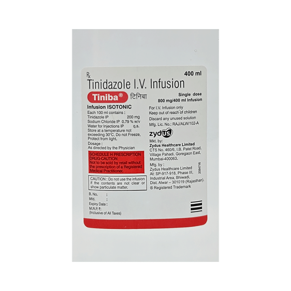 TINiBa 800mg Infusion is an antibiotic medicine that helps your body fight infections caused by bacteria and parasites. It is used to treat infections of the liver, stomach, intestines, vagina, brain, heart, lungs, and skin. TINiBa 800mg Infusion helps prevent an infection after surgery. It is also used in the treatment of dental infections, leg ulcers, and pressure sores. This injection is administered under the supervision of a healthcare professional and should not be self-administered. Your symptoms may get better after a short time but you should finish the course of treatment even if you feel well, otherwise, some bacteria may survive, and the infection may come back. Do not drink any alcohol while taking this medicine and for some days after stopping it. Otherwise, you may get unpleasant side effects like nausea, vomiting, and stomach pain.The most common side effects of this medicine are headache, dryness in mouth, and nausea. These are usually mild but let your doctor know if they bother you or last more than a few days. You can try using sugarless candies or lozenges to overcome any dryness or metallic taste in the mouth.Before using this medicine, inform your doctor if you are allergic to any medicine or have any kidney or liver problems or any disease of the nervous system. This medicine should not be taken if you are pregnant or breastfeeding unless it is absolutely necessary and prescribed by your doctor.