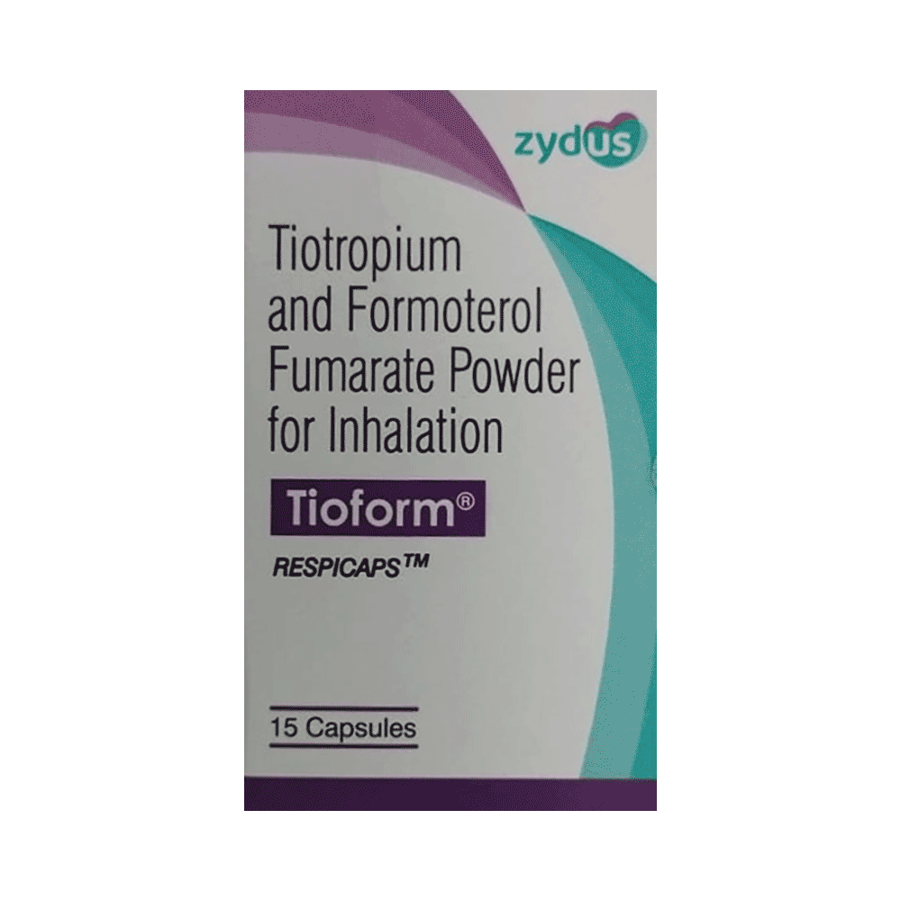 Tioform Respicap is used to treat chronic obstructive pulmonary disorder (a lung disorder in which the flow of air to the lungs is blocked). It helps in relaxing the muscles of the air passages and making it easier to breathe. It relieves coughing, wheezing, and shortness of breath. Your doctor will tell you how often you need to use your Tioform Respicap. The effect of this medicine may be noticeable after a few days, but will only reach its maximum after a few weeks. This medicine must be used regularly to be effective, so go on taking it even if you don't have any symptoms. If you stop taking it, your COPD may get worse. To get the benefit from this medicine, you need to make sure you get your inhaler technique right, otherwise, it does not work well.The most common side effects of Tioform Respicap are nausea, diarrhea, dry mouth, vomiting, dizziness, nasopharyngitis (inflammation of the throat and nasal passages), and insomnia. If you experience any of these symptoms, don’t stop taking it, but do talk to your doctor. You can prevent some of these symptoms by rinsing your mouth and throat with water or brushing your teeth after using your inhaler. If you experience any other symptoms and you are worried about them, consult your doctor.Before taking this medicine, you should tell your doctor if you are pregnant, planning pregnancy, or breastfeeding.