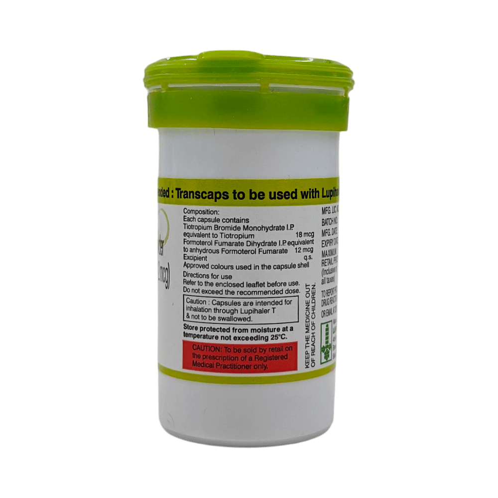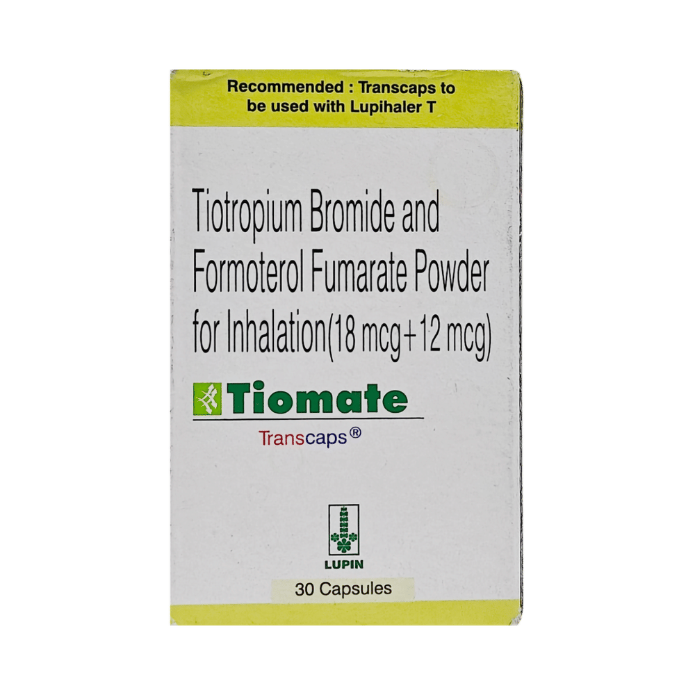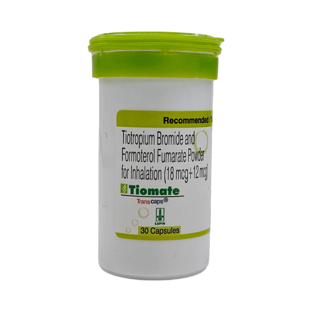 Tiomate 12mcg/18mcg Transcaps is a combination of two medicines: Formoterol and Tiotropium. Formoterol is a bronchodilator while Tiotropium is an anticholinergic. They work by relaxing the muscles in the airways and widening them. Together, they make breathing easier.