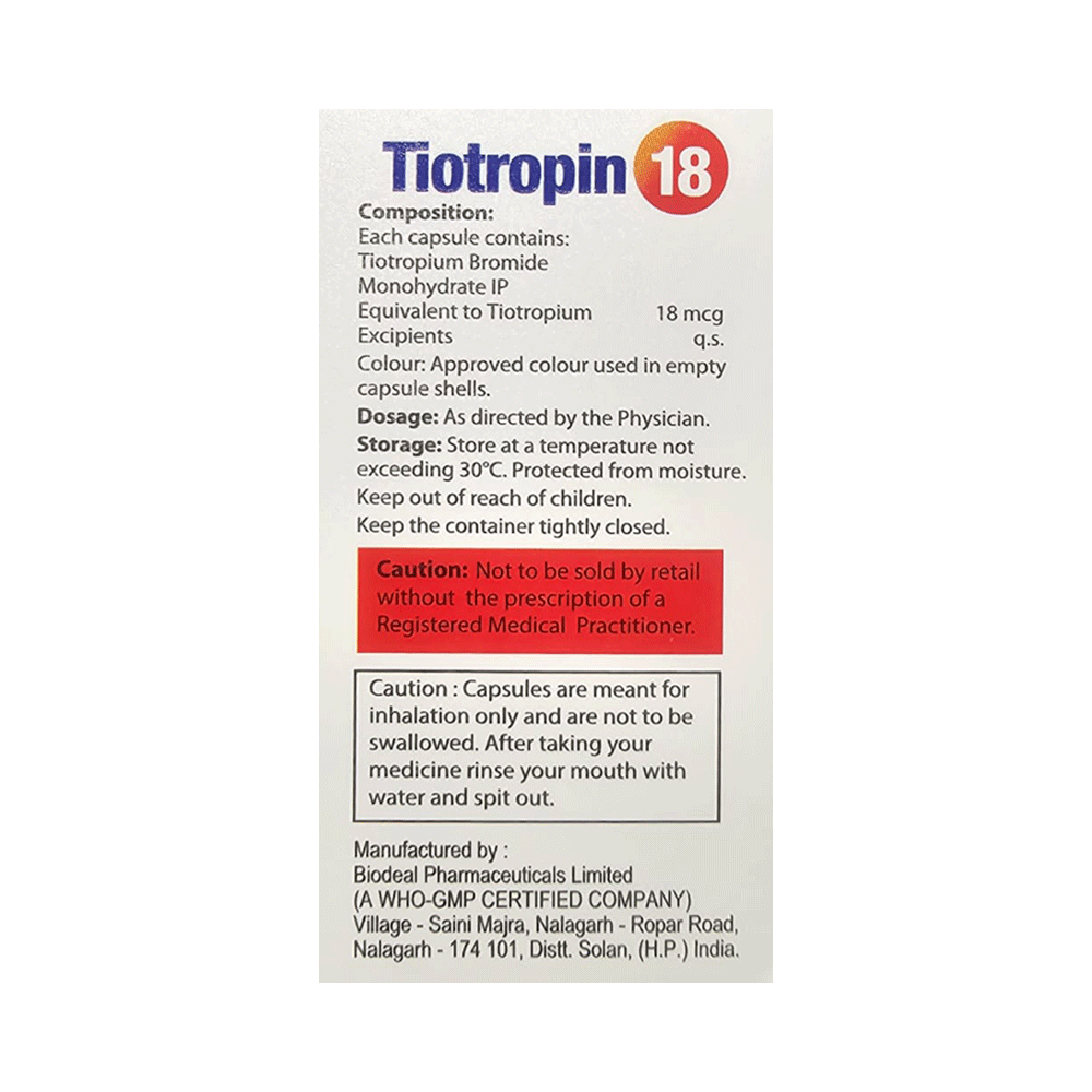 Tiotropin 18 Capsules is an anticholinergic medicine. It is used in the treatment of chronic obstructive pulmonary disease and asthma. It relaxes the airway muscles and makes it easier to breathe. This helps relieve symptoms such as chest tightness, shortness of breath, wheezing, and coughing. Tiotropin 18 Capsules is only for inhalational purpose, use it in the dose and duration as prescribed by your doctor. The first dose is given under medical supervision to prevent the side effects happen during first use. For better results, it is suggested to take it at the same time every day. The dose and how often you take it depends on what you are taking it for. Your doctor will decide how much you need to improve your symptoms. You should take this medicine for as long as it is prescribed for you. It does not prevent the already started breathing trouble or asthma attack, hence always carry your medical inhaler with you for an emergency.The most common side effect of this medicine is dry mouth. If these bother you or appear serious, let your doctor know. To overcome dry mouth, it is advised to increase water intake, carry sugar candy, or maintain good oral hygiene. If you experience any other side effects, let your doctor know.Before taking this medicine, let your doctor know if you have liver or kidney disease, or if you are pregnant or breastfeeding. Your doctor should also know about all other medicines you are taking as many of these may make this medicine less effective or change the way it works.