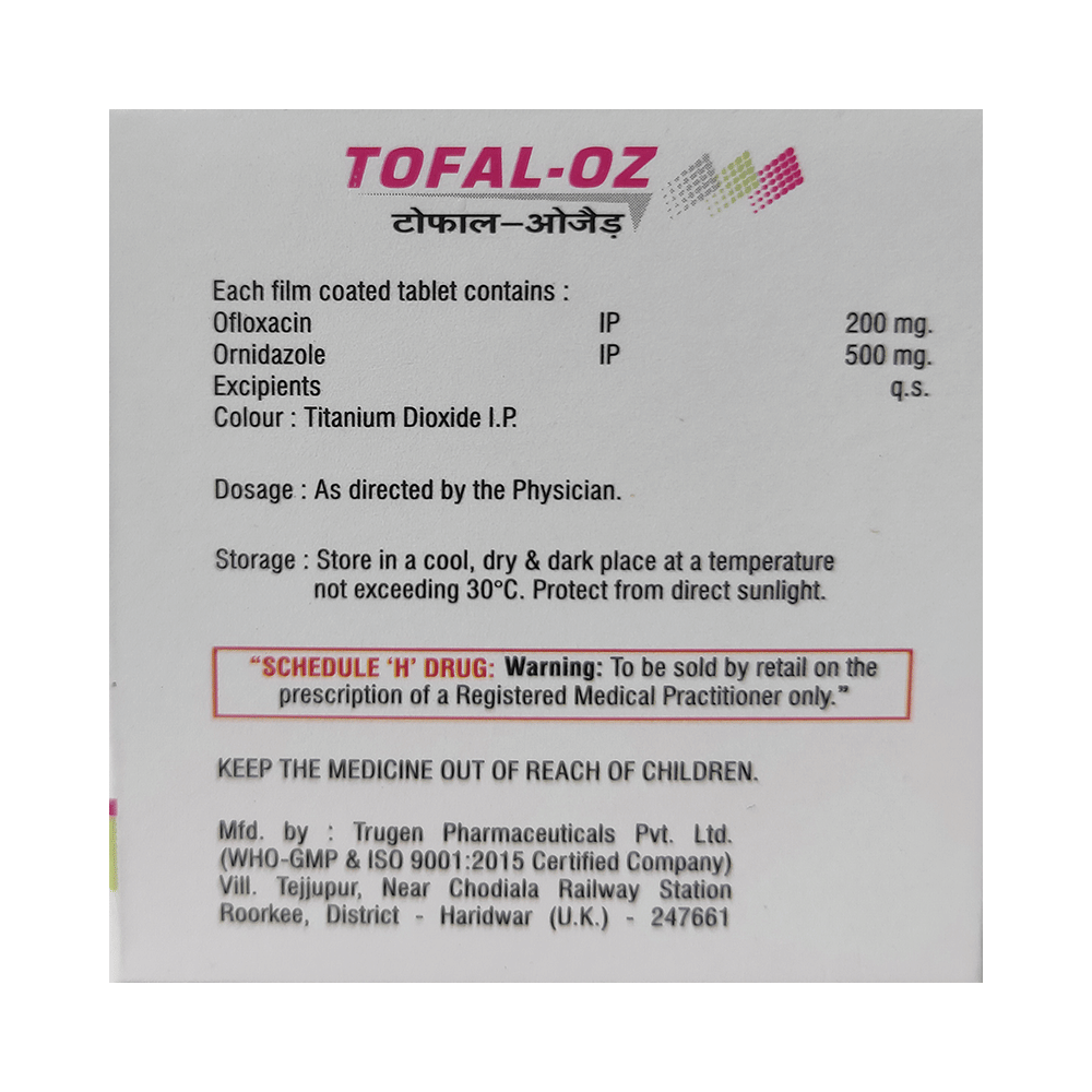 Tofal-OZ Tablet is a combination of two antibiotics. It is used in the treatment of bacterial and parasitic infections. It effectively treats a wide range of bacterial infections that may occur in the teeth, lungs, gastrointestinal infections, urinary and genital tract. Tofal-OZ Tablet is best taken with food. Take it at a fixed time to ensure better efficacy. Do not take more than the recommended dose, as it may have harmful effects on your body. If you miss a dose, take it as soon as you remember. The treatment must be completed even if you feel better to ensure a complete recovery.This medicine may lead to some side effects such as nausea, vomiting, stomach pain, loss of appetite, dizziness, and headache. To overcome any such side effects, it is advised to eat a healthy balanced diet and drink plenty of fluid. If any of the side effects get aggravated, consult your doctor immediately. If you experience any allergic reaction (rashes, itching, swelling, shortness of breath, etc.), you must seek immediate medical help.Before taking this medicine, you should tell your doctor if you have any problems with your liver or kidneys. Also, tell your doctor if you are on any medication for any health condition. Pregnant or breastfeeding women should also consult with the doctors before taking it. Avoid drinking alcohol as it can cause excessive dizziness with this medicine. It usually does not impair your ability to drive, but you should not drive if it makes you feel sleepy or dizzy. If you have known allergies to the medicine, refrain from using this medicine. It is advised to take proper rest during the course of treatment for the medicine to work effectively.