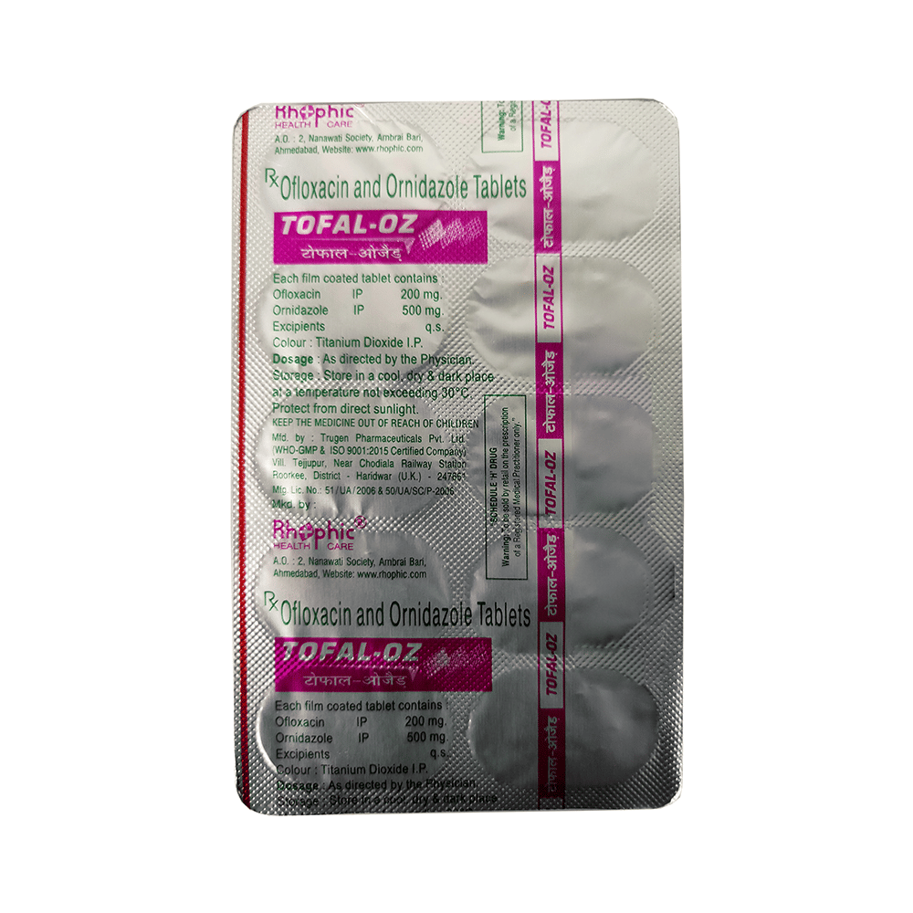 Tofal-OZ Tablet is a combination of two antibiotics: Ofloxacin and Ornidazole. Ofloxacin works by preventing the bacterial cells from dividing and repairing, thereby killing the bacteria. Ornidazole kills parasites and anaerobic bacteria that cause infections by damaging their DNA. Together, they treat your infection effectively.
