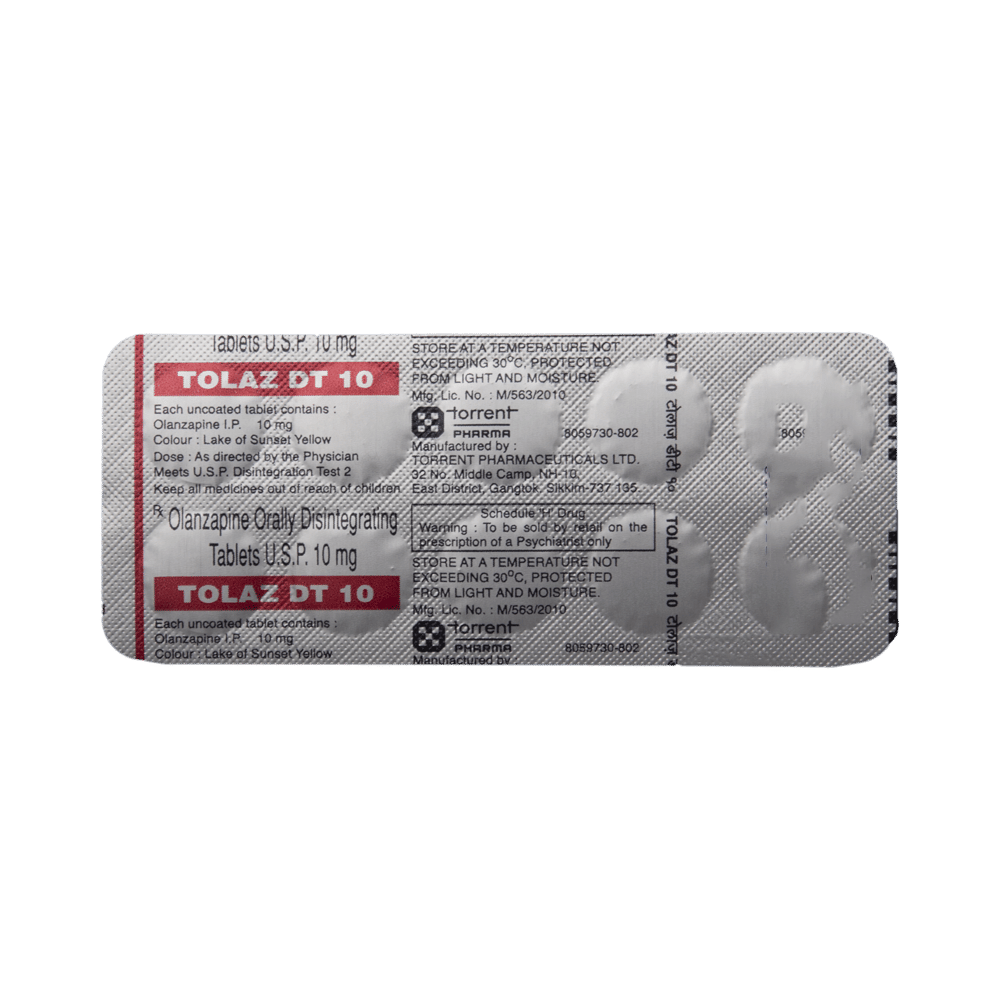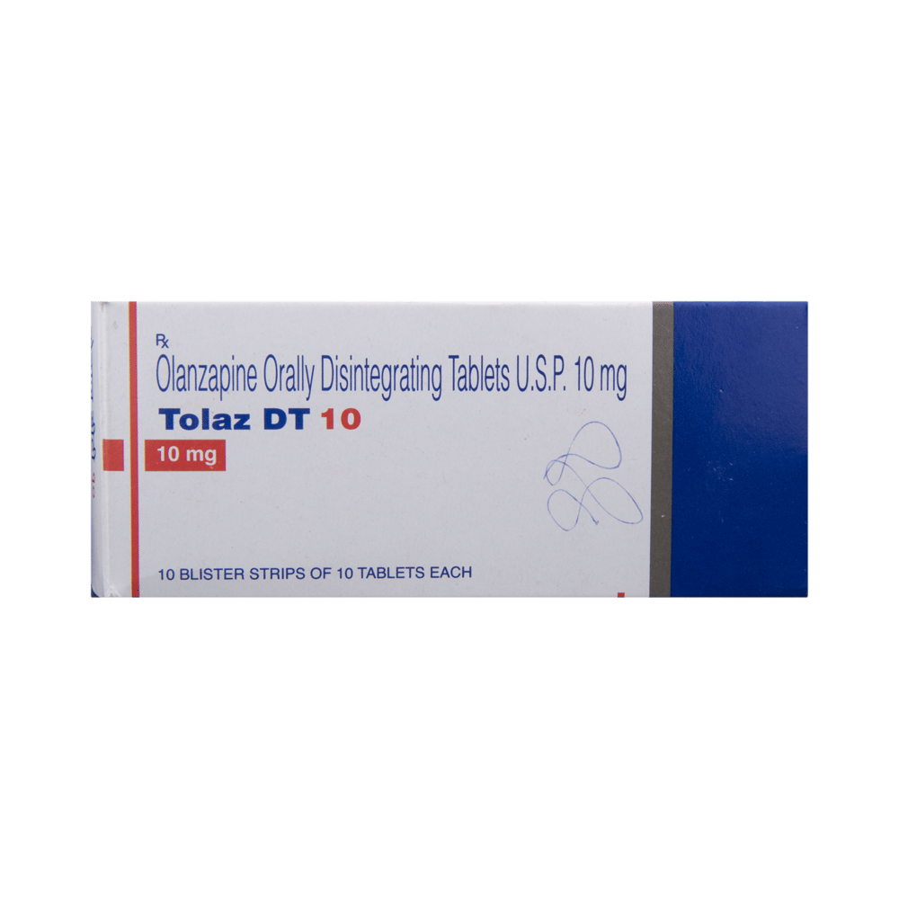 Tolaz DT 10 Tablet is used in the treatment of schizophrenia (a mental disorder that can result in hallucinations or delusions and also adversely affects a person’s ability to think and behave) and mania. Tolaz DT 10 Tablet may be taken with or without food. However, it is advised to take it at the same time each day as this helps to maintain a consistent level of medicine in the body. Take this medicine in the dose and duration as advised by your doctor and if you have missed a dose, take it as soon as you remember. This medication mustn't be stopped suddenly without talking to your doctor as it may worsen your symptoms.Some common side effects of this medicine include dryness in the mouth, constipation, muscle rigidity, and restlessness. Initially, this medicine may cause a sudden drop in blood pressure when you change positions, so it is better to rise slowly if you have been sitting or lying down. It also causes dizziness and sleepiness, so do not drive or do anything that requires mental focus until you know how this medicine affects you.However, this medicine may increase your weight, blood sugar, and cholesterol levels but, modifying your lifestyle by having a healthy diet and exercising regularly can reduce this side effect. You should be cautious as in rare cases it may cause serious side effects like very high blood sugar levels or seizures.