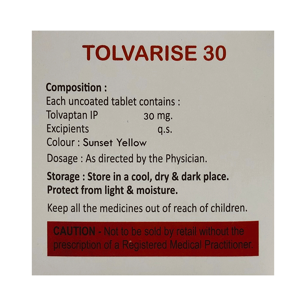 Tolvarise 30mg Tablet is a medicine used in the treatment of low levels of sodium in the blood. It treats low levels of sodium in the blood, which can result from conditions such as heart failure, cirrhosis, and syndrome of inappropriate antidiuretic hormone (SIADH). Tolvarise 30mg Tablet can be taken with or without food. It should be taken exactly as prescribed by your doctor. Your doctor will decide the dose and how often you should take them. You should take this medicine regularly to get the most benefit from it. Do not stop taking the medicine even if you feel better unless the doctor tells you so.Using this medicine may cause few common side effects such as frequent urge to urinate, nocturia (increased urge to urinate during the night), dryness in mouth, increased thirst, nausea, increased blood creatinine, hyperkalemia, and constipation. Let your doctor know if any of these side effects do not go away with time or get worse. Before using this medicine, inform your doctor if you have any problems with your kidneys or liver. While on this medicine, your doctor will closely monitor the sodium levels in your blood. You should also tell your doctor all the other medications you are taking.