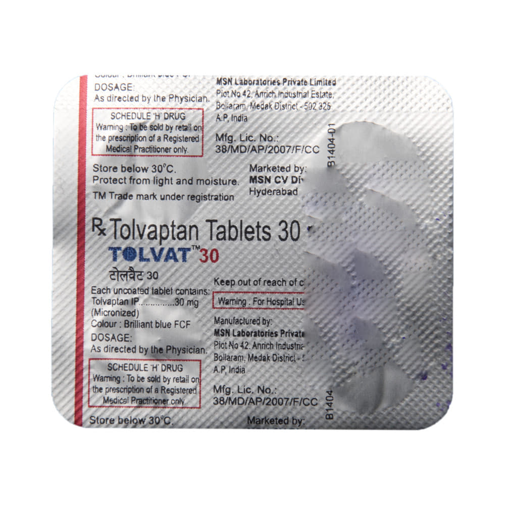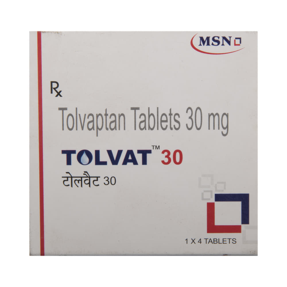 Tolvat 30 Tablet is a medicine used in the treatment of low levels of sodium in the blood. It treats low levels of sodium in the blood, which can result from conditions such as heart failure, cirrhosis, and syndrome of inappropriate antidiuretic hormone (SIADH). Tolvat 30 Tablet can be taken with or without food. It should be taken exactly as prescribed by your doctor. Your doctor will decide the dose and how often you should take them. You should take this medicine regularly to get the most benefit from it. Do not stop taking the medicine even if you feel better unless the doctor tells you so.Using this medicine may cause few common side effects such as frequent urge to urinate, nocturia (increased urge to urinate during the night), dryness in mouth, increased thirst, nausea, increased blood creatinine, hyperkalemia, and constipation. Let your doctor know if any of these side effects do not go away with time or get worse. Before using this medicine, inform your doctor if you have any problems with your kidneys or liver. While on this medicine, your doctor will closely monitor the sodium levels in your blood. You should also tell your doctor all the other medications you are taking.