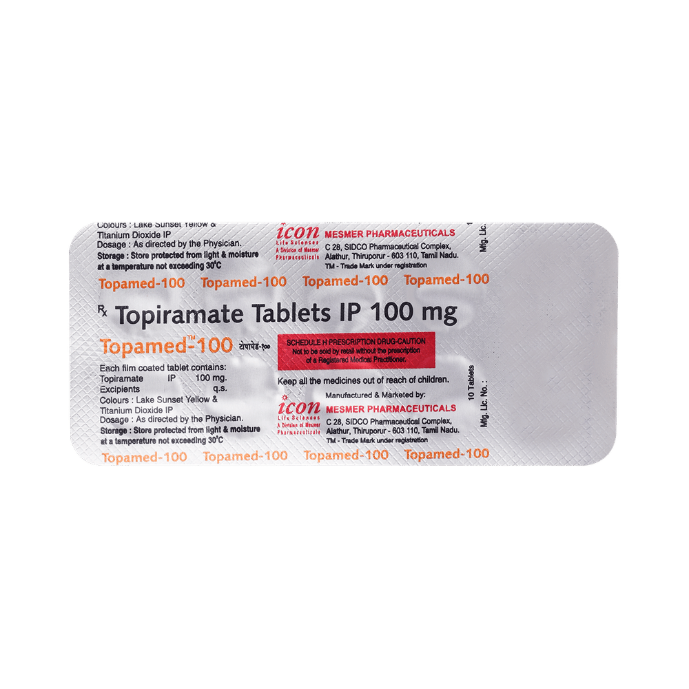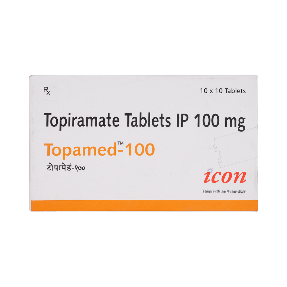 Topamed 100mg Tablet is a medicine used to treat epilepsy (seizures) and to prevent migraines. It is also used in the treatment of Lennox-Gastaut syndrome (a rare, but severe form of epilepsy that starts in early childhood). Topamed 100mg Tablet may be taken with or without food, preferably at the same time, each day. If you have missed a dose, take it as soon as you remember it and finish the full course of treatment even if you feel better. Stopping the medication suddenly without talking to your doctor may cause an increased frequency of seizures. Your doctor may advise regular monitoring of serum bicarbonate levels while you are taking this medicine.Some of the common side effects of this medicine include nausea, taste change, fatigue, diarrhea, weight loss, loss of appetite, and memory impairment. It may also cause vision problems like myopia or glaucoma, so it is important to get your eyesight checked before you start the treatment and regularly thereafter. You may experience dizziness and sleepiness, so do not drive or do anything that requires mental focus until you know how this medicine affects you. Please consult your doctor if these side effects bother you or do not go away.