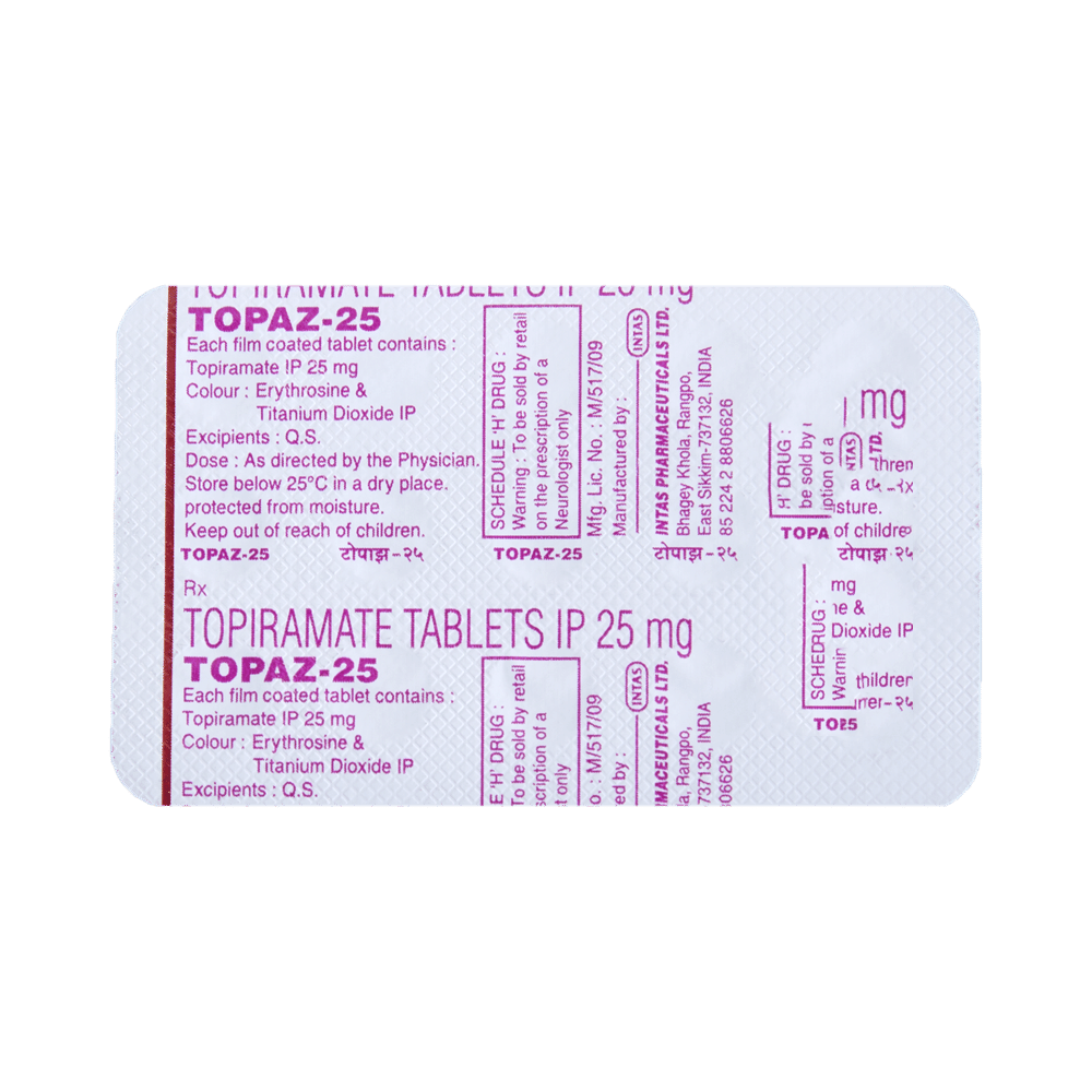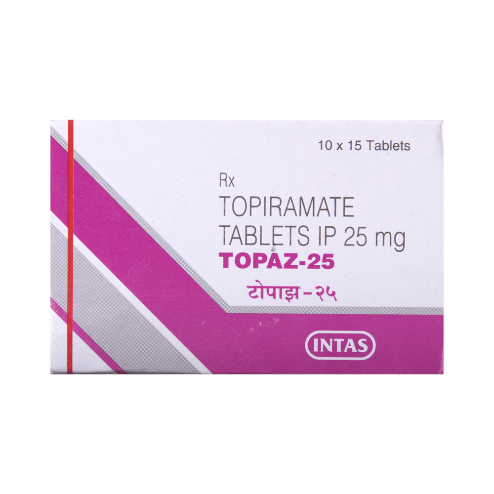 Topaz 25 Tablet is a medicine used to treat epilepsy (seizures) and to prevent migraines. It is also used in the treatment of Lennox-Gastaut syndrome (a rare, but severe form of epilepsy that starts in early childhood). Topaz 25 Tablet may be taken with or without food, preferably at the same time, each day. If you have missed a dose, take it as soon as you remember it and finish the full course of treatment even if you feel better. Stopping the medication suddenly without talking to your doctor may cause an increased frequency of seizures. Your doctor may advise regular monitoring of serum bicarbonate levels while you are taking this medicine.Some of the common side effects of this medicine include nausea, taste change, fatigue, diarrhea, weight loss, loss of appetite, and memory impairment. It may also cause vision problems like myopia or glaucoma, so it is important to get your eyesight checked before you start the treatment and regularly thereafter. You may experience dizziness and sleepiness, so do not drive or do anything that requires mental focus until you know how this medicine affects you. Please consult your doctor if these side effects bother you or do not go away.