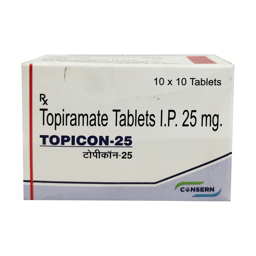 Topicon 25mg Tablet is a medicine used to treat epilepsy (seizures) and to prevent migraines. It is also used in the treatment of Lennox-Gastaut syndrome (a rare, but severe form of epilepsy that starts in early childhood). Topicon 25mg Tablet may be taken with or without food, preferably at the same time, each day. If you have missed a dose, take it as soon as you remember it and finish the full course of treatment even if you feel better. Stopping the medication suddenly without talking to your doctor may cause an increased frequency of seizures. Your doctor may advise regular monitoring of serum bicarbonate levels while you are taking this medicine.Some of the common side effects of this medicine include nausea, taste change, fatigue, diarrhea, weight loss, loss of appetite, and memory impairment. It may also cause vision problems like myopia or glaucoma, so it is important to get your eyesight checked before you start the treatment and regularly thereafter. You may experience dizziness and sleepiness, so do not drive or do anything that requires mental focus until you know how this medicine affects you. Please consult your doctor if these side effects bother you or do not go away.