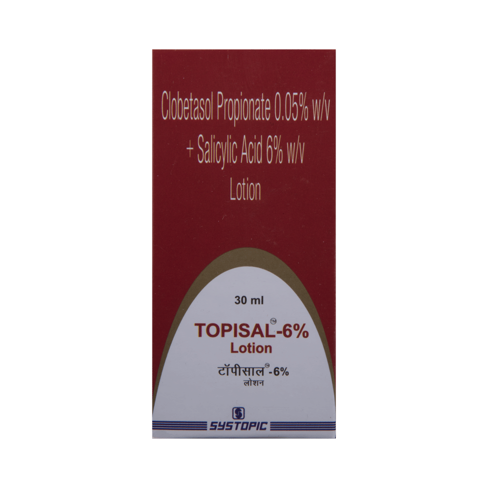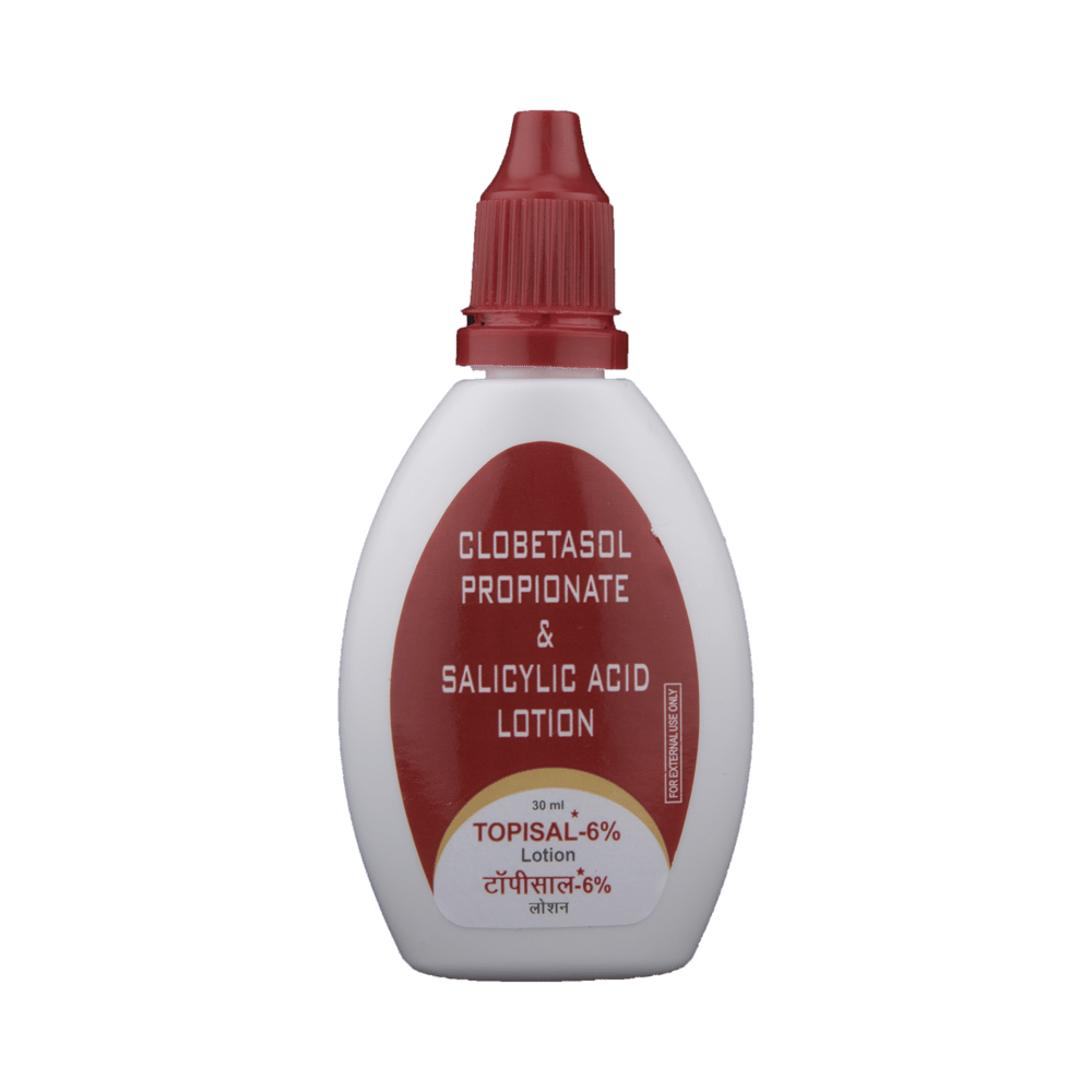 Topisal 6% Lotion has a combination of medicines that are used to treat eczema and psoriasis. It helps to provide relief from redness, itching, and swelling. It removes dead skin cells and helps in softening the skin. Topisal 6% Lotion should be used in the dose and duration as advised by your doctor. Wash your hands before using this medicine. It is advised to check the label for directions before use. It is for external use only.Do not use this medicine more than the recommended dose. Inform your doctor if you have known allergies to this medicine. The common side effects of this medicine include peeling of the skin, thinning of the skin, burning, itching, irritation, and redness at the application site.If these side effects or any other symptoms which you think are because of this medicine persist for a longer duration, please consult your doctor. Inform your doctor if you are pregnant or are suffering from any other disease. This medicine is safe to use in breastfeeding mothers.