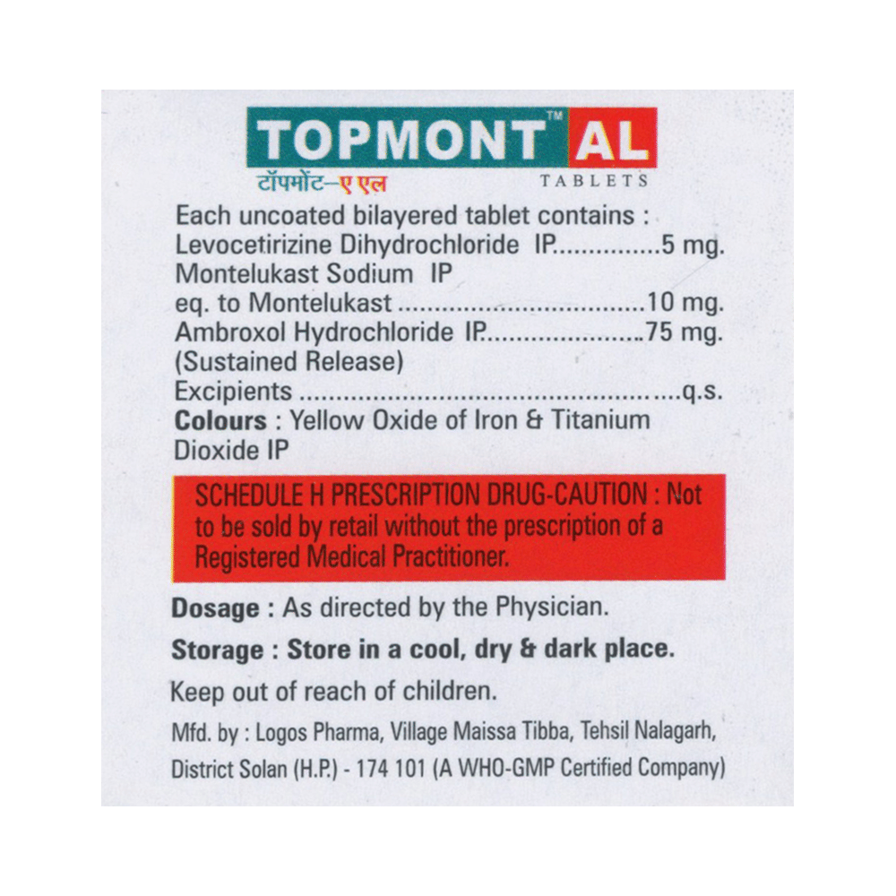 Topmont AL Tablet SR is a combination of three medicines: Ambroxol, Levocetirizine and Montelukast. Ambroxol is a mucolytic which thins and loosens mucus (phlegm), making it easier to cough out. Levocetirizine is an antiallergic which relieves allergy symptoms like runny nose, watery eyes and sneezing. Montelukast is a leukotriene antagonist. It works by blocking the action of leukotriene, a chemical messenger. This reduces inflammation in the airways and nose and improves your symptoms.