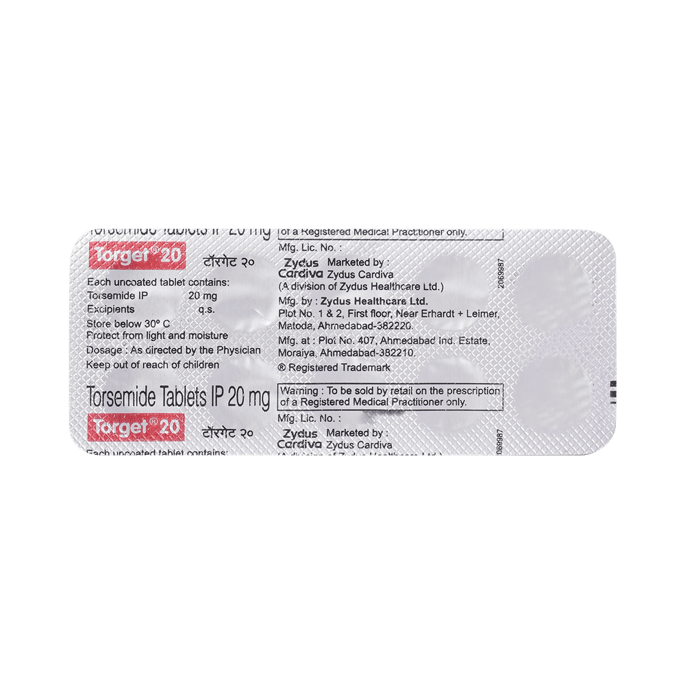 Torget 20 Tablet belongs to a group of medicines called diuretics or water tablets. It is used to reduce the swelling (edema) caused by too much water in the body in people who have heart failure, liver disease, or kidney disease. This medicine is also used to treat high blood pressure. Torget 20 Tablet helps your body get rid of extra water and salt through urine. It may be used alone or in combination with other medicines as per the dose advised by your doctor. It can be taken with or without food and should be taken at the same time each day. It is best to avoid taking this medicine within 4 hours of your bedtime to prevent having to get up at night to urinate.It is important to continue taking this medication even if you feel well. If you stop taking it without consulting your doctor, your condition may worsen. Lifestyle changes like reducing stress, restricting salt intake, and stopping smoking may help this medication work better.Common side effects of this medicine include headache, dizziness, dehydration, decreased blood pressure, and stomach upset. These are usually mild and disappear after a short time. Consult your doctor if they bother you or do not go away.Before taking this medicine, let your doctor know if you have any liver problems. Pregnant or breastfeeding women should also consult their doctor before taking it. Regular monitoring of kidney function and electrolyte levels is important while using this medicine. It may reduce the potassium level in your blood so your doctor may ask you to add potassium-rich foods to your diet (such as bananas, coconut water, etc.) or prescribe supplements.