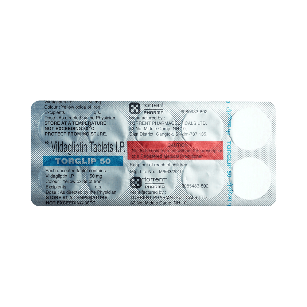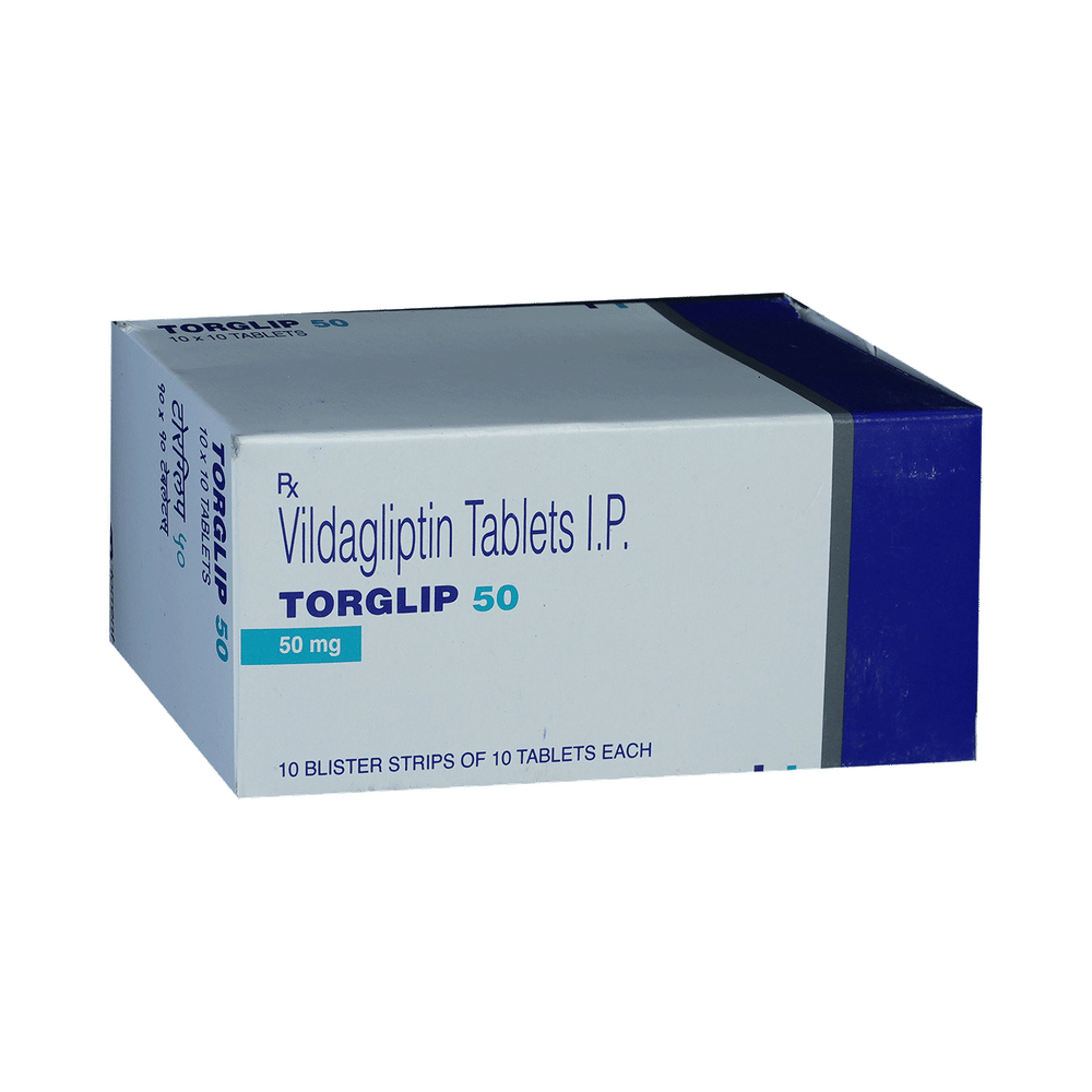 Torglip 50 Tablet is a medicine used to treat type 2 diabetes mellitus. It is used together with a healthy diet and regular exercise to control blood sugar levels. This helps to prevent serious complications of diabetes like kidney damage and blindness. Torglip 50 Tablet is normally prescribed when diet and exercise alone or other medicines do not prove sufficient to control your blood sugar level. It may prescribe alone or in combination with other diabetes medicines. It can be taken with or without food. The dose will depend on your condition and blood sugar levels. Use it strictly as advised by your doctor.You should take it regularly at the same time each day to get the most benefit. Do not stop taking the medicine unless advised by your doctor. It is important to stay on the diet and exercise program recommended by your doctor while taking this medicine. Your lifestyle plays a big part in controlling diabetes.The most common side effects of Torglip 50 Tablet include hypoglycemia, tremor, headache, dizziness, fatigue, and nausea. It is important to recognize the symptoms of hypoglycemia (such as lightheadedness, sweating, dizziness, fainting, and dry mouth) and know how to deal with it. You can carry sugar or glucose candy and have them to control your symptoms if you experience any. Contact your doctor if the side effects do not go away or worry you.Before taking this medicine, let your doctor know if you have ever had kidney disease, heart disease, or pancreas problems. Pregnant or breastfeeding women should also consult their doctor before taking it. Some other medicines you are taking may interfere with this medicine's working. So, make sure your doctor knows about all the other medicines you are using. Limit your alcohol intake while taking this medicine because it can increase your risk of developing low blood sugar levels. You may need regular tests such as kidney function and blood glucose levels to check that the medicine is working properly.