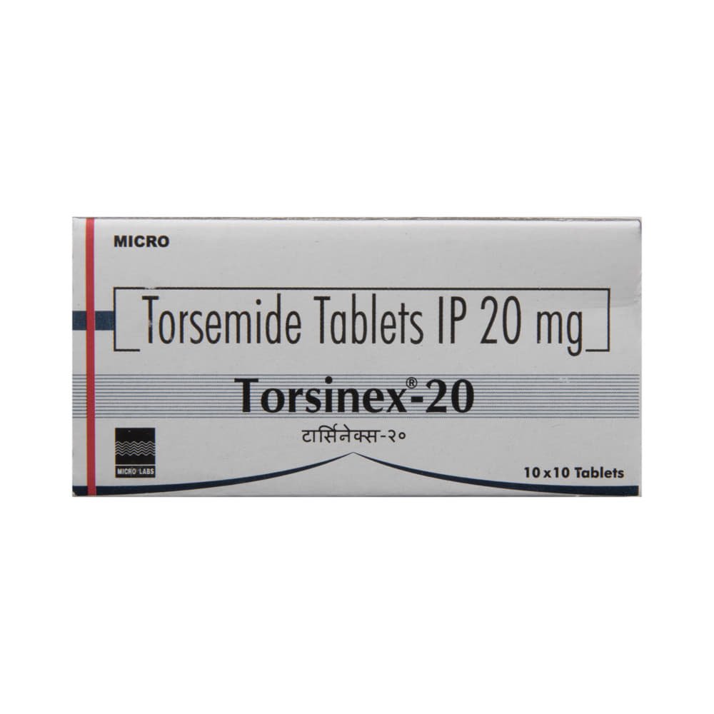 Torsinex 20 Tablet belongs to a group of medicines called diuretics or water tablets. It is used to reduce the swelling (edema) caused by too much water in the body in people who have heart failure, liver disease, or kidney disease. This medicine is also used to treat high blood pressure. Torsinex 20 Tablet helps your body get rid of extra water and salt through urine. It may be used alone or in combination with other medicines as per the dose advised by your doctor. It can be taken with or without food and should be taken at the same time each day. It is best to avoid taking this medicine within 4 hours of your bedtime to prevent having to get up at night to urinate.It is important to continue taking this medication even if you feel well. If you stop taking it without consulting your doctor, your condition may worsen. Lifestyle changes like reducing stress, restricting salt intake, and stopping smoking may help this medication work better.Common side effects of this medicine include headache, dizziness, dehydration, decreased blood pressure, and stomach upset. These are usually mild and disappear after a short time. Consult your doctor if they bother you or do not go away.Before taking this medicine, let your doctor know if you have any liver problems. Pregnant or breastfeeding women should also consult their doctor before taking it. Regular monitoring of kidney function and electrolyte levels is important while using this medicine. It may reduce the potassium level in your blood so your doctor may ask you to add potassium-rich foods to your diet (such as bananas, coconut water, etc.) or prescribe supplements.