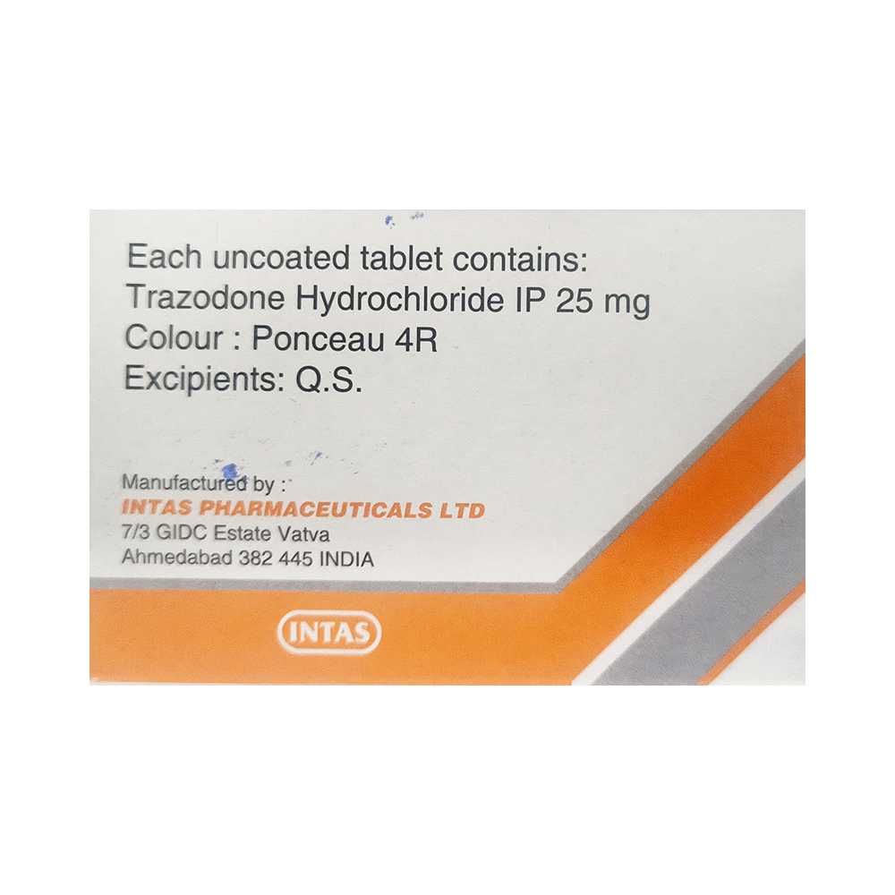 Trazonil 25 Tablet is used in the treatment of depression. This medicine helps by increasing the level of chemical messengers in the brain that relax the nerves and have a calming effect on the brain. Trazonil 25 Tablet should be taken with food. It is advised to take this medicine at a fixed time each day. You should never skip any doses and finish the full course of treatment even if you feel better. This medication mustn't be stopped suddenly as it may worsen your symptoms.Some common side effects of this medicine include constipation and blurred vision. It even causes dizziness and sleepiness, so do not drive or do anything that requires mental focus. Moreover, most of the side effects are immediate and often go away with time. Please consult your doctor if these bother you or do not go away.Before taking Trazonil 25 Tablet, it is important to inform your doctor if you have any history of fits, severe kidney, liver, or heart problems, narrow-angle glaucoma, or any mental disorder. Inform your doctor if you develop any unusual changes in mood or behavior, new or worsening depression if you have any suicidal thoughts.