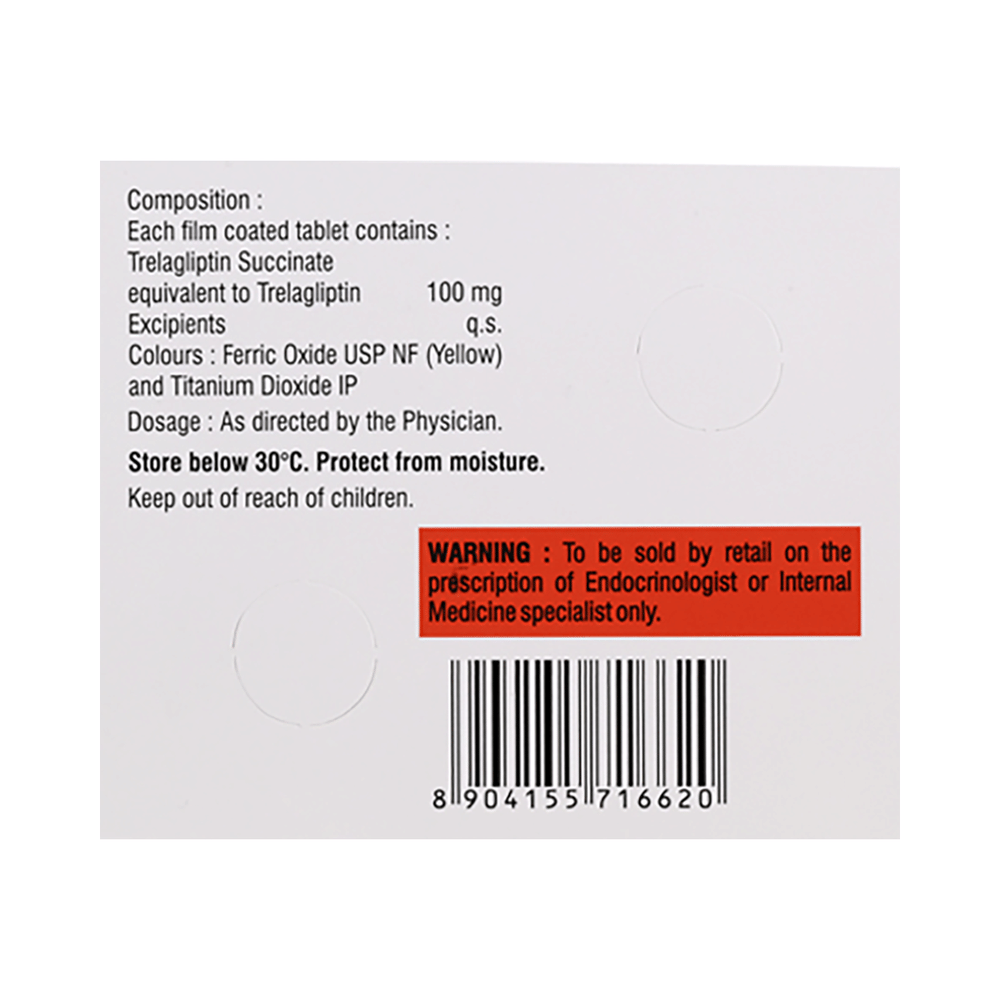 Trelaglip 100 Tablet is an oral weekly drug for the control of type 2 diabetes. It acts by inhibiting the enzyme DPP-4, which favors enhanced release of insulin and suppressed production of sugar in the liver, thus enhancing the control of blood sugar after meals. In order for Trelaglip 100 Tablet to help regulate blood sugar levels, take it precisely as directed, usually once a week. Skipping doses will limit its glucose-control ability. To remain consistent, select a regular day of the week for your dose, and consider putting reminders in place. Take it with food, and have follow-ups regularly with your doctor to check on your response and modify treatment where necessary.Common side effects of Trelaglip 100 Tablet include hypoglycemia, blisters, and bowel obstruction. If side effects persist or worsen, consult your doctor. Always use as directed to minimize risks and ensure safe use.Trelaglip 100 Tablet is contraindicated in patients with a known hypersensitivity to the drug or any of its components. It should be used cautiously in people with a history of pancreatitis, kidney impairment, or heart problems. Although rare, serious allergic reactions and joint pain have been reported. It is not recommended for use in type 1 diabetes or diabetic ketoacidosis. Patients should inform their doctor about all existing conditions and current medications to avoid adverse interactions.