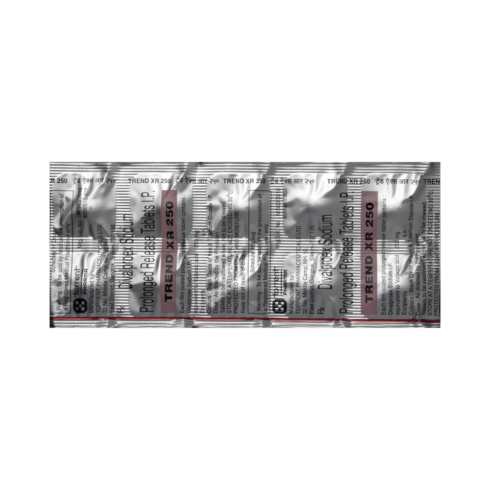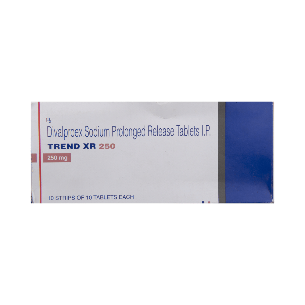 Trend XR 250 Tablet is a medication used to treat epilepsy, seizures, bipolar disorder, mania, trigeminal neuralgia, and migraines. It works by stabilizing brain activity. Always use it under medical supervision for safe and effective treatment. Trend XR 250 Tablet may be used alone or in combination with other medicines. Your doctor will determine the appropriate dose and frequency to effectively control your symptoms. You can take this medicine with or without food, but for the best results, take it at the same time each day. It usually takes a couple of weeks to work. It is important to take this medicine regularly and for as long as you are advised, even if you feel well. Missing doses may trigger seizures, and if you stop, your condition may get worse. It should never be stopped suddenly.The most common side effects of Trend XR 250 Tablet include headache, constipation, nausea, vomiting, dizziness, weight gain, rash, back pain, and abdominal pain. Most of these are not serious. Continue taking the medicine, but consult your doctor if these side effects persist or become bothersome. However, if you notice a skin rash or redness, tell your doctor straight away. Long-term treatment with this medicine can cause osteoporosis (reduced bone mass) and increase your risk of breaking a bone. Also, Trend XR 250 Tablet may rarely lead to suicidal thoughts and behaviors. If your mood becomes depressed, tell your doctor.Trend XR 250 Tablet may not be suitable for everybody. Before using it, tell your doctor if you have ever had heart problems, kidney or liver disease, difficulty urinating, depression, or suicidal thoughts. Some medicines can interfere with it and should not be taken together, so tell your doctor about all the medicines you are taking to make sure it is safe for you. If you are pregnant, do not take this medicine without asking your doctor. Avoid drinking alcohol, as it may enhance certain side effects and increase the risk of seizures. You may need frequent blood tests to help your doctor make sure you are taking the right dose both before you start and while you are using it.