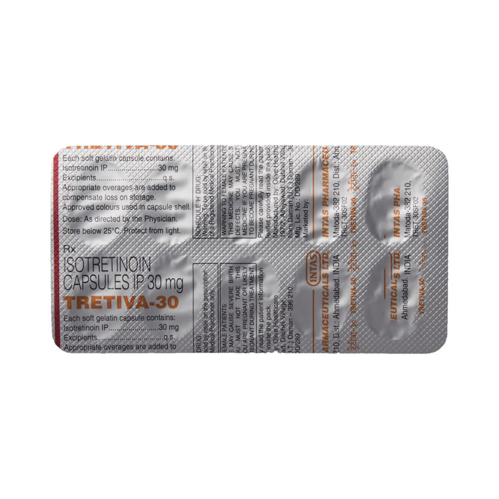 TRETiva 30 Capsule belongs to a group of medicines called retinoids (vitamin A derivative). It is used to treat severe acne that has not responded to other treatments. TRETiva 30 Capsule should be used in the dose and duration as advised by your doctor. Take it with food, preferably at the same time each day to avoid a missed dose. It may take several weeks for your symptoms to improve but keep taking the medicine regularly to get the most benefit. If you notice no improvement after a few weeks, see your doctor again.The most common side effects include dry skin, rash, and increased liver enzymes. They are not usually serious and often disappear after getting used to the medicine but if they bother you or do not go away, tell your doctor.TRETiva 30 Capsule may make you more sensitive to sunlight so you should limit your exposure to the sun. It may also make your skin more fragile. Avoid any waxing (hair removal), or laser treatments during treatment. Additionally, it may cause dryness of the mouth, lips, and eyes so drink plenty of water and use a moisturizer. This medicine may lead to birth defects, do consult your doctor if you are pregnant or planning pregnancy.