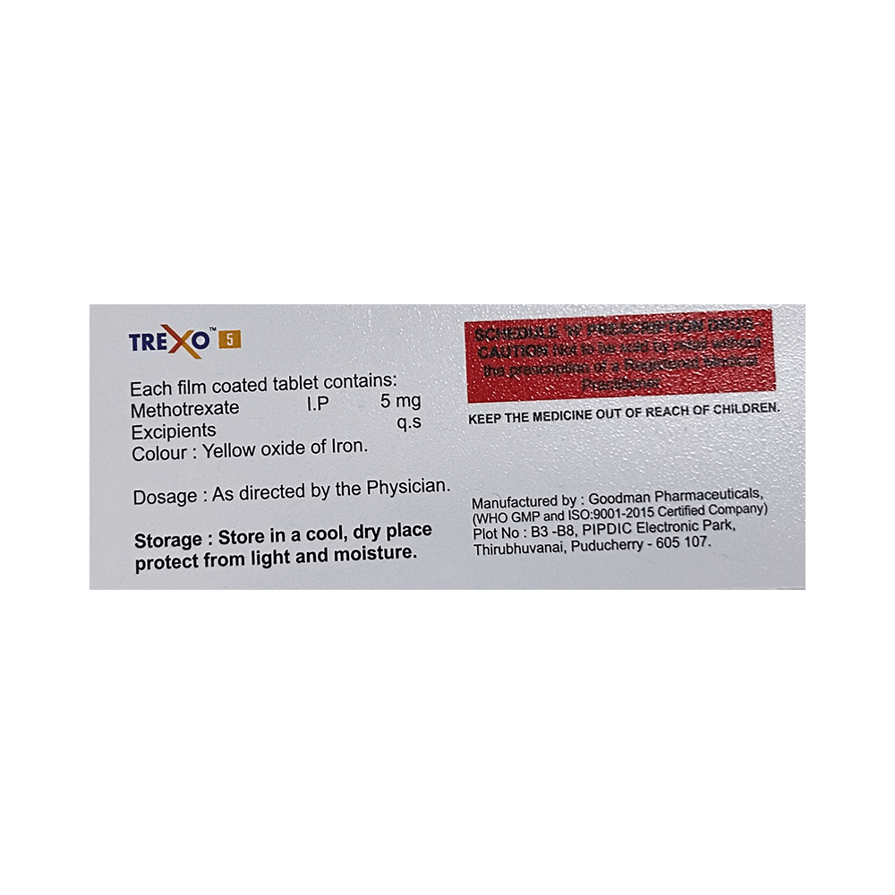 Trexo 5mg Tablet is a medicine used for the treatment of cancer in various parts of the body. It is also used to treat rheumatoid arthritis, severe and uncontrolled psoriasis, and Crohn’s disease. It works by slowing the growth of abnormal cells and reducing immune system activity in autoimmune conditions. Trexo 5mg Tablet may be used alone or in combination with other medicines. You should take it exactly as your doctor has advised. Taking too much of it can cause serious side effects. It may take several weeks or months for you to see or feel the benefits, but do not stop taking it unless your doctor tells you to.The most common side effects of this medicine are ulcerative stomatitis, hair loss, low blood cell count, increased liver enzymes, nausea, and abdominal distress. Your doctor may advise you to take folic acid to reduce some of these. If they do not go away or get worse, tell your doctor. There may be ways of preventing or reducing these effects.Trexo 5mg Tablet may lower your ability to fight infections and lead to problems with your blood, liver, or kidneys. Your doctor may perform several tests, such as blood tests, X-rays, and physical examinations, both before and during the treatment with this medicine to check for these problems.Before taking it, tell your doctor if you have problems related to the stomach, liver, or kidneys, or are taking any medicines to treat infections. Many other medicines can affect or be affected by this medicine, so let your doctor know about all your medications. This medicine is not recommended during pregnancy or while breastfeeding, as it may harm the baby. You should avoid consuming alcohol while taking this medicine, as it may increase your risk of liver damage.