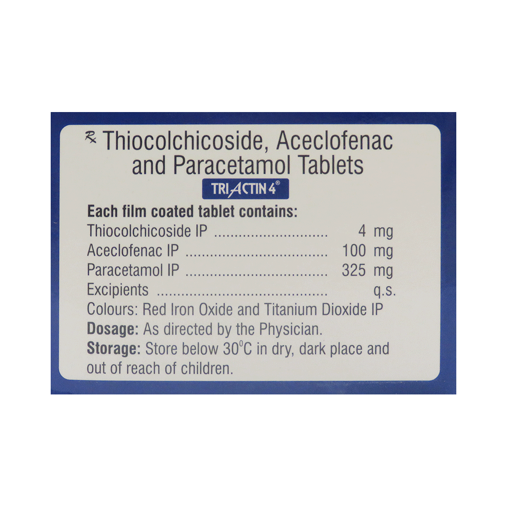 Triactin 4 Tablet is a combination medicine that helps in relieving muscular pain. It works by blocking the release of certain chemical messengers that cause pain, inflammation, and fever. This improves the movement of muscles and provides relief from pain and discomfort. Triactin 4 Tablet should be taken with food. This will prevent you from getting an upset stomach. The dose and duration will depend on the severity of your condition. You should keep taking the medicine even if you feel better until the doctor says it is alright to stop using it.Using this medicine may cause few common side effects such as nausea, vomiting, heartburn, stomach pain, diarrhea, loss of appetite, and dryness in the mouth. If any of these side effects do not resolve with time or get worse, you should let your doctor know. Your doctor may be able to suggest ways of preventing or reducing the side effects. In general, you should try to use the smallest amount necessary to control your symptoms.Before using the medicine, you should tell your doctor if you have any other medical conditions or disorders. To make sure it is safe, you should let your doctor know all the other medicines you are taking. Also, tell your doctor if you have any problems with your liver or kidneys. You should avoid the consumption of alcohol while on treatment with this medicine. Pregnant and breastfeeding women should consult their doctors first before using the medicine.