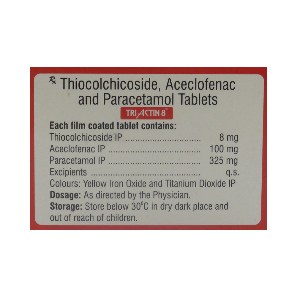 Triactin 8 Tablet is a combination medicine that helps in relieving muscular pain. It works by blocking the release of certain chemical messengers that cause pain, inflammation, and fever. This improves the movement of muscles and provides relief from pain and discomfort. Triactin 8 Tablet should be taken with food. This will prevent you from getting an upset stomach. The dose and duration will depend on the severity of your condition. You should keep taking the medicine even if you feel better until the doctor says it is alright to stop using it.Using this medicine may cause few common side effects such as nausea, vomiting, heartburn, stomach pain, diarrhea, loss of appetite, and dryness in the mouth. If any of these side effects do not resolve with time or get worse, you should let your doctor know. Your doctor may be able to suggest ways of preventing or reducing the side effects. In general, you should try to use the smallest amount necessary to control your symptoms.Before using the medicine, you should tell your doctor if you have any other medical conditions or disorders. To make sure it is safe, you should let your doctor know all the other medicines you are taking. Also, tell your doctor if you have any problems with your liver or kidneys. You should avoid the consumption of alcohol while on treatment with this medicine. Pregnant and breastfeeding women should consult their doctors first before using the medicine.