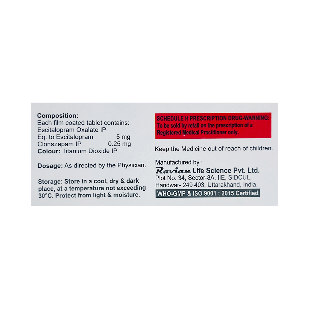 Salt Composition: Clonazepam (0.25mg) + Escitalopram Oxalate (5mg)