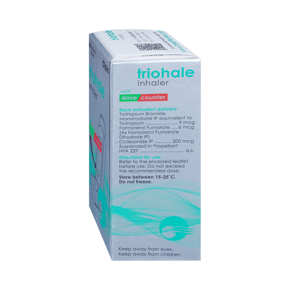 Triohale Inhaler is used for the treatment of chronic obstructive pulmonary disorder (a lung disorder in which the flow of air to the lungs is blocked). It helps in relaxing the muscles of the air passages and making it easier to breathe. It relieves coughing, wheezing and feeling short of breath. Your doctor will tell you how often you need to use your inhaler. The effect of this medicine may be noticeable after a few days but will only reach its maximum after a few weeks. This medicine must be used regularly to be effective, so go on taking it even if you don't have any symptoms. That means it’s doing its job. If you stop taking it your COPD may get worse. This medicine should not be used to relieve sudden shortness of breath. If sudden shortness of breath occurs, use your rescue inhaler. To get the benefit from this medicine you need to make sure you get your inhaler technique right, otherwise, it Does not work as well.The most common side effects are nausea, vomiting, dryness in the mouth, fungal infection of mouth, respiratory tract infection, bronchitis (inflammation of the airways), cough, sore throat, hoarseness of voice, and headache. If you get there, don’t stop taking it but do talk to your doctor. You can prevent some of these symptoms by rinsing your mouth and throat with water or brushing your teeth after using your inhaler. There are other, rarer side effects which can be serious. Talk to your doctor if you're worried about them.