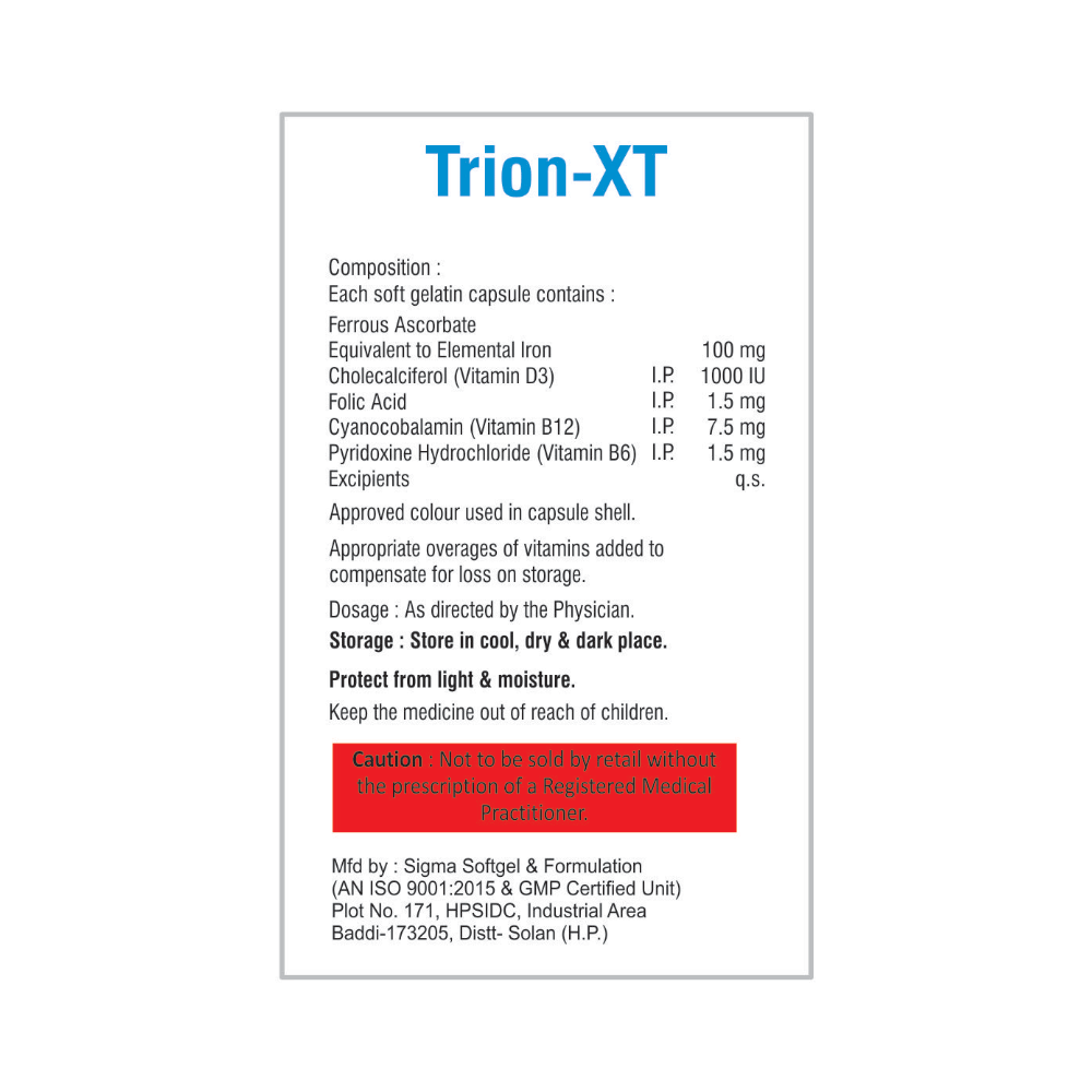 Trion-XT Softgel Capsule is a combination of five medicines: Ferrous Ascorbate, Vitamin D3, Folic Acid, Vitamin B12, and Pyridoxine. Ferrous Ascorbate is a combination of iron and vitamin C. Iron works by replenishing the iron stores in your body and corrects iron deficiency anemia. Vitamin C (ascorbate) is added to enhance the absorption of iron in the body. Vitamin D3 is a form of vitamin D. It raises vitamin D levels in your blood. This in turn raises calcium levels in your blood by helping you absorb more calcium from food. Folic Acid is a form of vitamin B. It plays a vital role in the formation of red blood cells, which carry oxygen throughout the body. It is also essential in pregnancy due to its role in the development of the unborn baby's brain and spinal cord. Vitamin B12 is a nutritional supplement that helps in treating certain anemias and nerve problems. Pyridoxine is a nutritional supplement that possesses anti-nausea properties and helps in proper functioning of nerves.