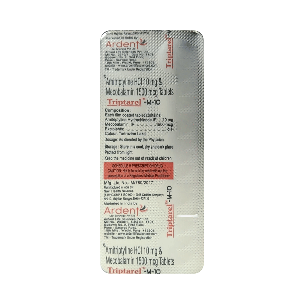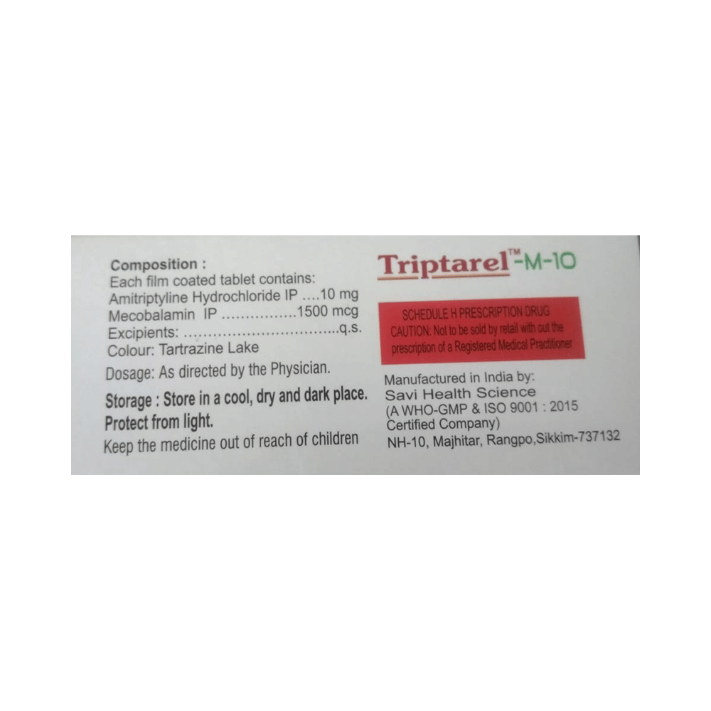 Triptarel-M 10 Tablet is a combination of two medicines used to treat neuropathic pain. It works by protecting the nerve fibers against damage, repairing the damaged nerves. This way it effectively relieves the pain sensation and also elevates the mood. Triptarel-M 10 Tablet may be taken with or without food. However, it is advised to take it at the same time each day as this helps to maintain a consistent level of medicine in the body. Take this medicine in the dose and duration advised by your doctor. If you miss a dose of this medicine, take it as soon as you remember. Finish the full course of the treatment even if you feel better. It is important not to stop taking this medicine suddenly.Some common side effects of this medicine include constipation, dry mouth, difficulty in urination, drowsiness, blurred vision, and increased heart rate. It may also cause dizziness and sleepiness, so do not drive or do anything that requires mental focus until you know how this medicine affects you. However, these are temporary and usually resolve on their own. Please consult your doctor if these do not subside or bother you.You should avoid alcohol while taking Triptarel-M 10 Tablet, as it may worsen certain side effects. This medicine can also lead to weight gain, eat a healthy balanced diet, avoid snacking with high-calorie food, and exercise regularly. Inform your doctor if you develop any unusual changes in mood or behavior, new or worsening depression, or suicidal thoughts or behavior.