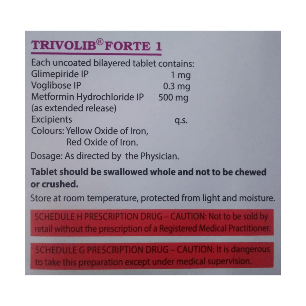 Trivolib Forte 1 Tablet ER belongs to a category of medicines known as anti-diabetic drugs. It is a combination of medicines used to treat type 2 diabetes mellitus in adults. It helps control blood sugar levels in people with diabetes. Take Trivolib Forte 1 Tablet ER with or immediately before meals. Take it regularly at the same time each day to get the most benefit. Your doctor will decide what dose is best for you, and this may change from time to time depending on how it is working according to your blood sugar levels.Keep taking this medicine, even if you feel well or your blood sugar levels are controlled. If you stop it without consulting your doctor, your blood sugar levels could rise and put you at risk of kidney damage, blindness, nerve problems, and loss of limbs. Remember that it is only part of a treatment program that should also include a healthy diet, regular exercise, and weight reduction as advised by your doctor. Your lifestyle plays a big part in controlling diabetes.Common side effects of Trivolib Forte 1 Tablet ER are nausea, vomiting, abdominal pain, and loss of appetite. Make sure you recognize the signs of low blood glucose levels, such as sweating, dizziness, headache, and shaking, and know how to deal with them. To prevent this, it's important to have regular meals and always carry a fast-acting source of glucose, such as sugary food or fruit juice, with you.Drinking alcohol can also increase your risk of low blood sugar levels and should be avoided. Other side effects that may be seen on taking this medicine include taste changes, nausea, diarrhea, stomach pain, headache, edema (swelling), blurred vision, bone fracture, and upper respiratory tract infection. Some people may find that they put on weight with this medicine.You should not take Trivolib Forte 1 Tablet ER if you have type 1 diabetes mellitus, if you have diabetic ketoacidosis (high levels of acid in your blood), or if you have severe kidney or liver disease. Before taking this medicine, tell your doctor if you have ever had heart disease, as it may not be suitable. Pregnant or breastfeeding women should also consult their doctor before taking it. Your blood sugar levels should be checked regularly, and your doctor may also advise blood tests to monitor your blood cell counts and liver function.