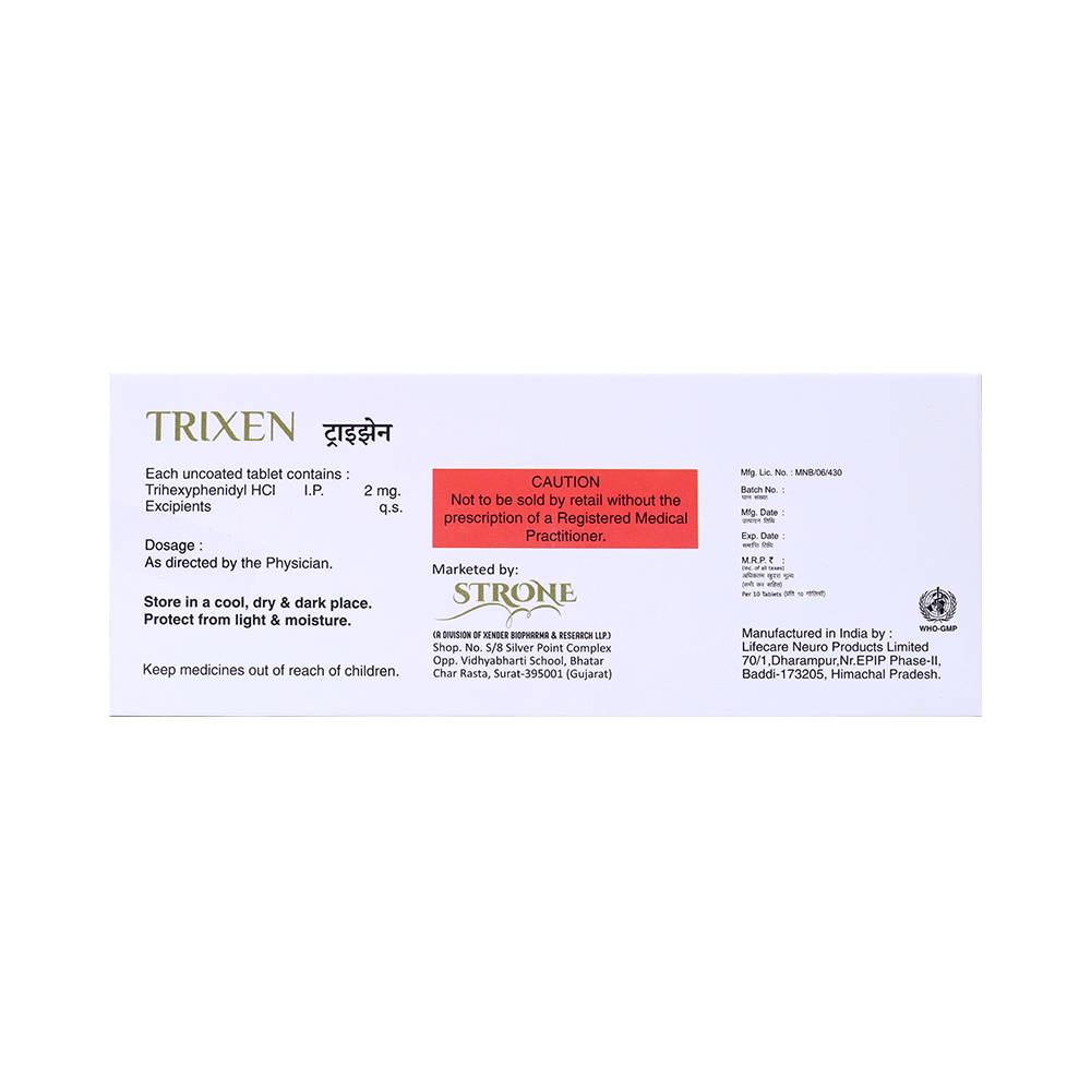 In Treatment of Parkinson's diseaseParkinson’s disease (PD) is a disorder of the central nervous system. It makes the muscles stiff which causes difficulties in standing and walking. PD also causes tremors and loss of balance. Trixen Tablet helps to treat the symptoms of Parkinson's Disease. It relaxes the stiff muscles and helps in easy movement without losing balance. Trixen Tablet is also used to treat side effects like abnormal movements caused by antipsychotic drugs. It is advisable not to stop this medicine without consulting your doctor. This is because a sudden stoppage can cause symptoms of Parkinson's disease to return. You can see that the drug is working if you are able to do your daily activities more easily and have a more active and better quality of life. In Treatment of Drug induced abnormal movementsTrixen Tablet is also used to treat side effects like abnormal movements caused by antipsychotic drugs. It helps restore normal body posture as well as control over muscle movements in the body. This will enable you to lead a normal life and improve your ability to carry out daily activities.show moreshow less