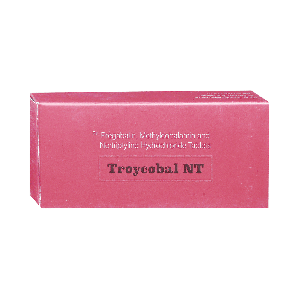 Troycobal NT 75mg/10mg/1500mcg Tablet is a combination of three medicines used to treat neuropathic pain. It works by decreasing pain by controlling calcium channel activity of the nerve cells. It also increases the level of chemical messengers in the brain that help in regulating the mood and protect nerve fibers. Troycobal NT 75mg/10mg/1500mcg Tablet can be taken with or without food. However, it is advised to take it at the same time each day as this helps to maintain a consistent level of medicine in the body. Take this medicine in the dose and duration advised by the doctor. If you miss a dose of this medicine, take it as soon as you remember. Finish the full course of the treatment even if you feel better. It is important not to stop taking this medicine suddenly as it may worsen your symptoms.Some common side effects of this medicine include constipation, weight gain, and dryness in mouth. It may cause dizziness and sleepiness, so do not drive or do anything that requires mental focus until you know how this medicine affects you. This medicine may cause weight gain and to control it, you should have a balanced diet and exercise regularly. You must inform your doctor if you develop any unusual changes in mood or behavior, new or worsening depression, or suicidal thoughts.Before taking this medicine let your doctor know if you suffer from kidney or liver disease. Your doctor should also know about all other medicines you are taking as many of these may make this medicine less effective or change the way it works. Inform your doctor if you are pregnant, planning pregnancy or breastfeeding.