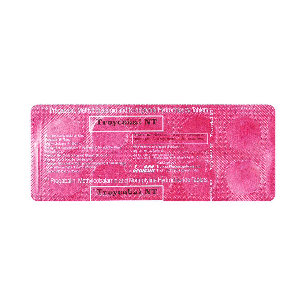 Troycobal NT 75mg/10mg/1500mcg Tablet is a combination of three medicines: Pregabalin, Nortriptyline and Methylcobalamin. Pregabalin is an alpha 2 delta ligand which decreases pain by modulating calcium channel activity of the nerve cells. Nortriptyline is a tricyclic antidepressant which increases the levels of chemical messengers (serotonin and noradrenaline) that stop the movement of pain signals in the brain. Methylcobalamin is a form of vitamin B which helps in the production of myelin, a substance that protects nerve fibers and rejuvenates damaged nerve cells. Together, they relieve neuropathic pain (pain from damaged nerves).