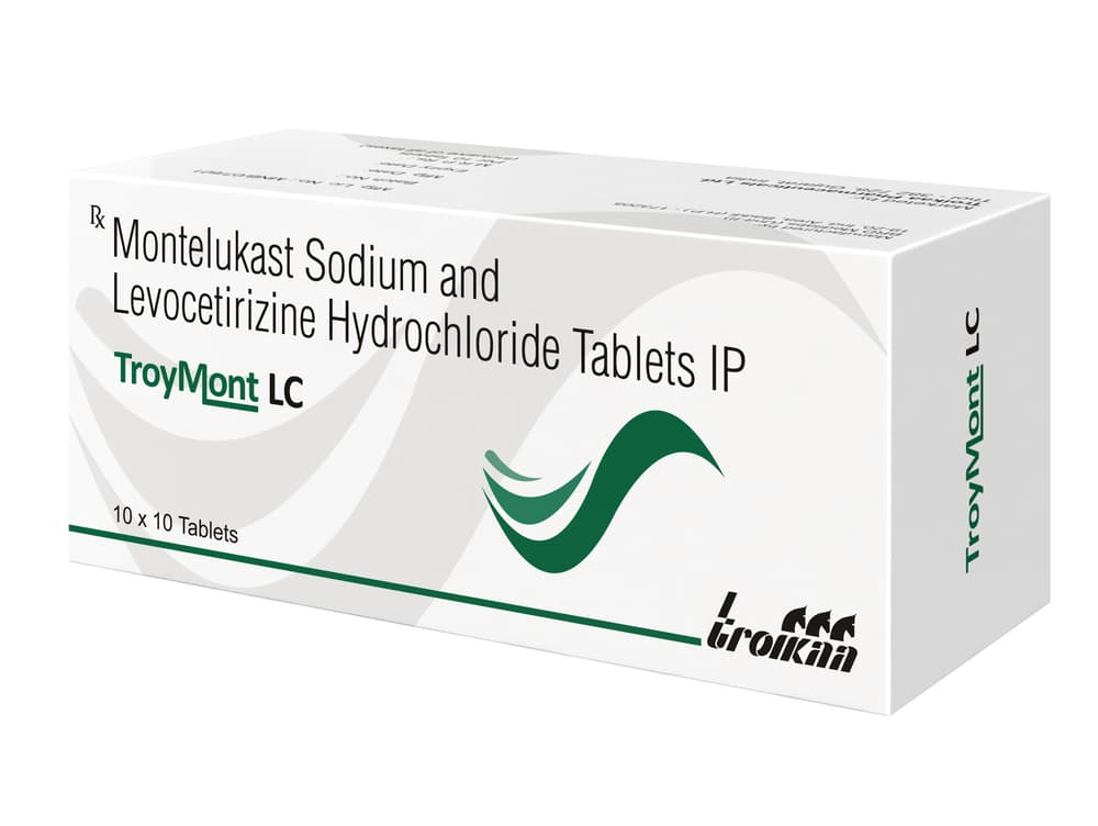 In Treatment of Allergic skin conditionsTroymont LC Tablet is effective in treating allergic skin conditions with inflammation and itching. It reduces the actions of chemicals in the body that cause inflammation of the skin. When used correctly it is a safe and effective treatment. It reduces the redness, rash, pain or itchiness caused by your skin’s reaction to an irritant. It thus improves your self-esteem and confidence as your appearance changes. Keep taking it for as long as it is prescribed to get the full benefits.In Treatment of Sneezing and runny nose due to allergiesTroymont LC Tablet is a combination medicine that provides relief from symptoms such as blocked or runny nose, sneezing and itchy or watery eyes. This will make it easier for you to go about your daily activities. It rarely has any serious side effects and you may only need to take it on days you have symptoms. If you are taking it to prevent getting symptoms you should use it regularly to get the most benefit.In Treatment of Hay feverHay fever, also called allergic rhinitis, causes cold-like signs and symptoms, such as a runny nose, itchy eyes, congestion, sneezing and sinus pressure. The only difference is that in hay fever, these symptoms are not produced due to a virus but are simply allergic responses of our body to allergens (allergy causing agents such as pollen). Troymont LC Tablet is used to provide relief from these symptoms of hay fever. It works by blocking the release of the chemical substance responsible for producing such allergy symptoms. Troymont LC Tablet is a safe medicine which helps treat hay fever and makes us feel at ease.show moreshow less