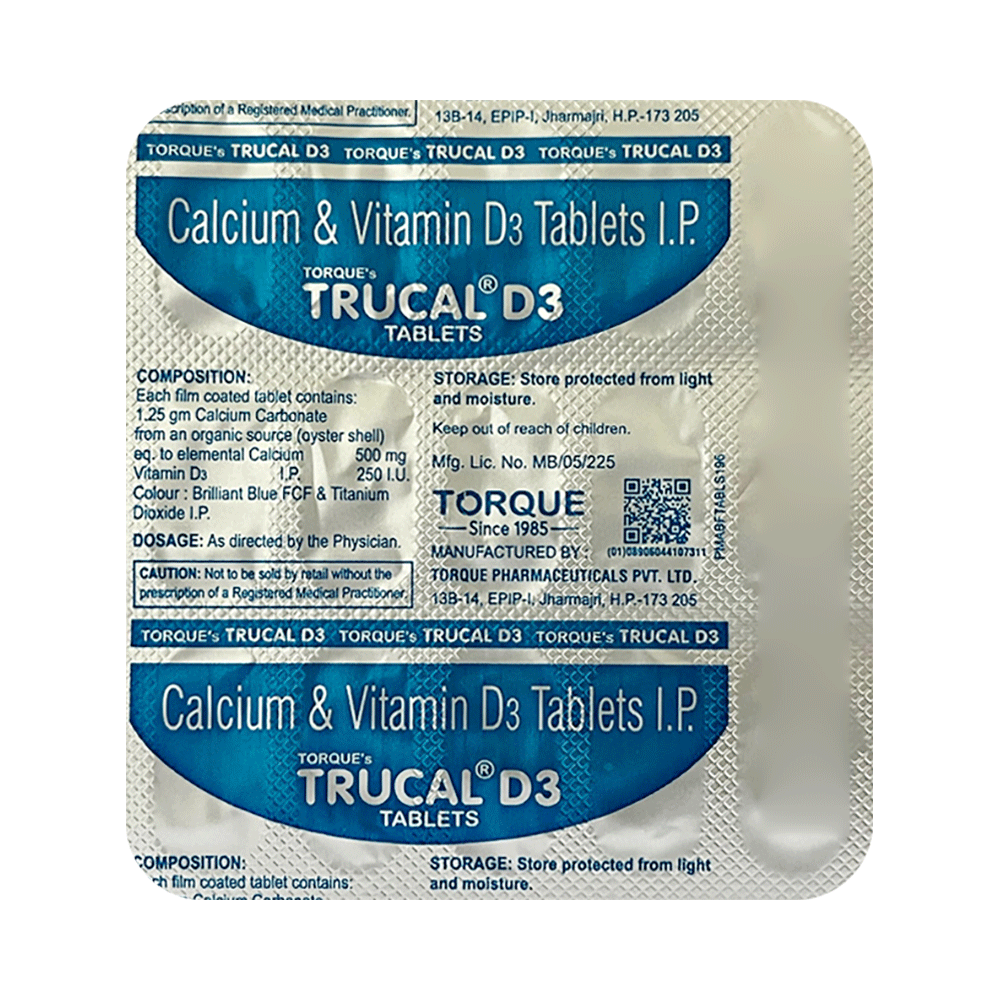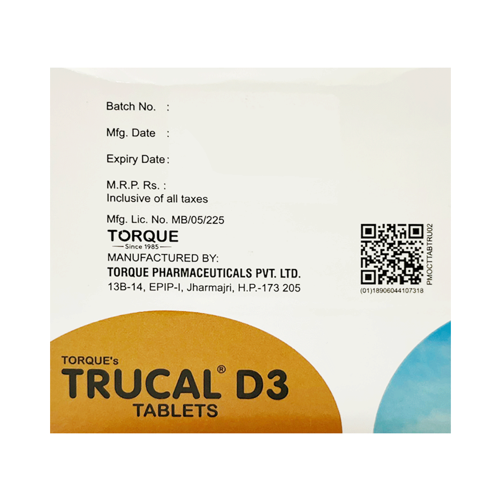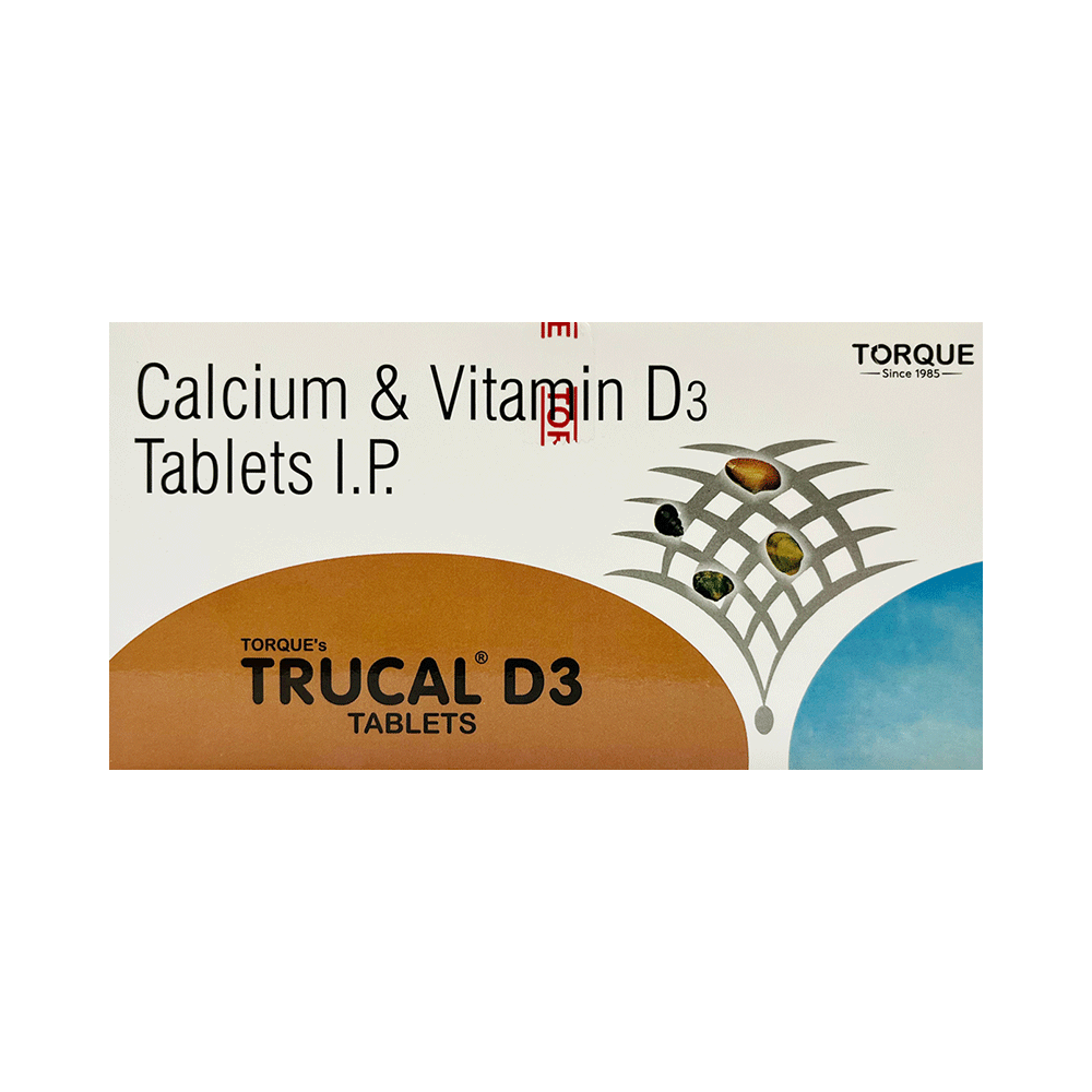 Trucal D3 Tablet is a combination of two nutritional supplements: calcium and vitamin D3. Calcium is added as a dietary supplement when the amount of calcium taken in the diet is not enough. Vitamin D3 is a form of vitamin D. It raises vitamin D levels in your blood. This, in turn, raises calcium levels in your blood by helping you absorb more calcium from food.