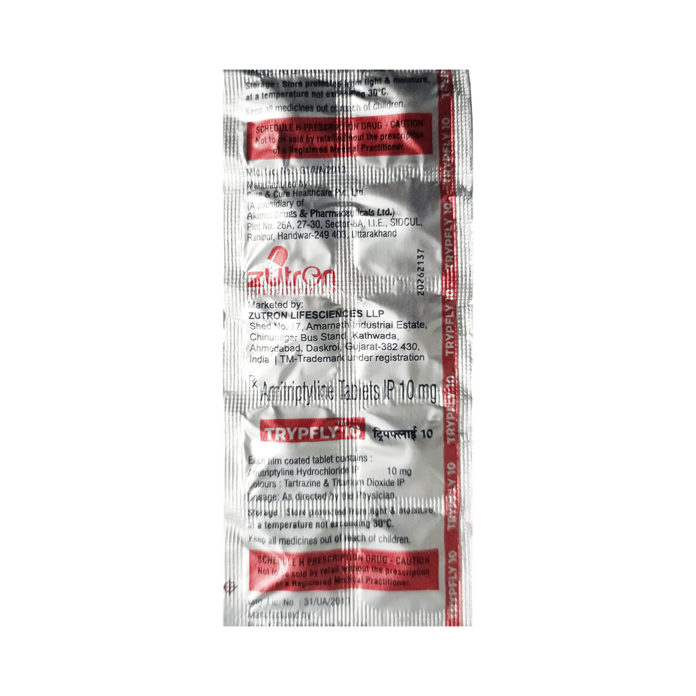 Trypfly 10 Tablet is a medicine used to treat depression by helping improve mood and reduce anxiety. It works by restoring the natural balance of certain brain chemicals that affect emotions. This helps relieve sadness, improves mental well-being, and makes daily life easier to manage. Trypfly 10 Tablet is normally taken before bedtime because it can make you sleepy. It can be taken with or without food. The dose and how often you need to take it will be decided by your doctor so that you get the right amount to control your symptoms.How long you need to use it will depend on what you are taking it for, but it is important to continue taking this medication even if you feel well. Do not stop taking the medicine suddenly without talking to your doctor. Stopping the medicine suddenly can worsen your condition or cause other symptoms. Your dose may be modified or gradually decreased before stopping the medication.The most common side effects of this medicine include constipation, dry mouth, sleepiness, dizziness, and headache. It may also make you aggressive or confused, and can cause weight gain in some people.This medicine is not addictive, but you can experience additional side effects (withdrawal symptoms) if you stop taking it suddenly. Your doctor may be able to suggest ways of preventing or reducing side effects if they bother you or do not go away. Serious side effects associated with this medicine are rare.